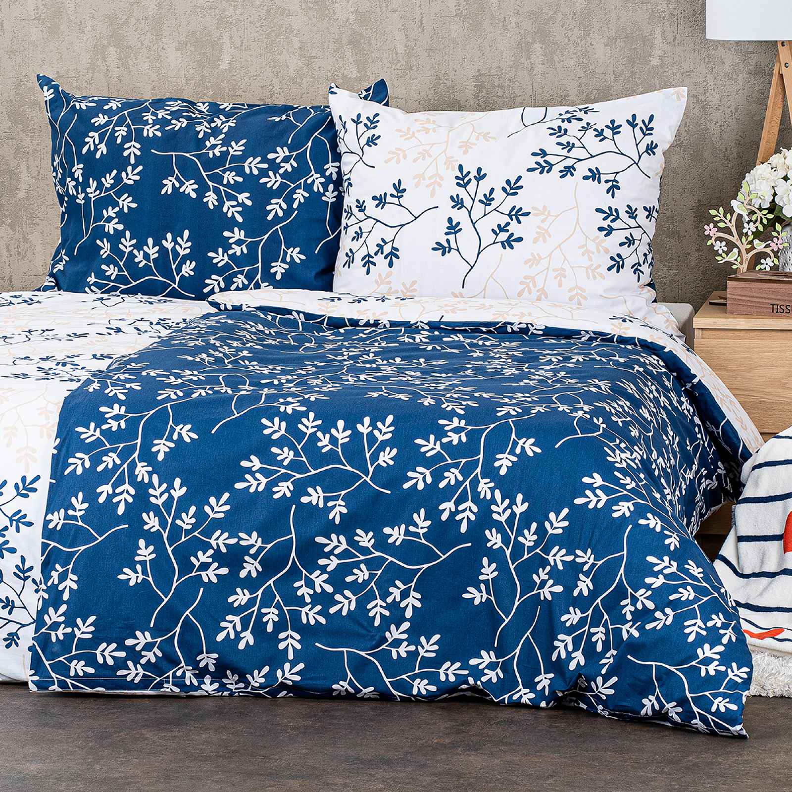 Elegantní bavlněné povlečení pro harmonickou ložnici i pohodové usínání. Decentní přírodní motiv větviček v kombinaci s uklidňujícím odstínem tmavě modré barvy krásně doladí každý interiér a z vaší ložnice udělá dokonalé místo pro relaxaci. Navíc je povlečení vyrobené z měkké a příjemné 100% bavlny, která zaručí lehké usínání jako na obláčku.Povlečení je oboustranné – z jedné strany tmavě modré s bílým vzorem, druhá strana je bílá s tmavě modrým a béžový motivem. Můžete ho tedy libovolně kombinovat a měnit svou postel každý den. Povlečení je opatřeno zapínáním na zip pro vaše maximální pohodlí. Souprava obsahuje: 1x povlak na polštář 70 x 90 cm 1x povlak na přikrývku 140 x 220 cm