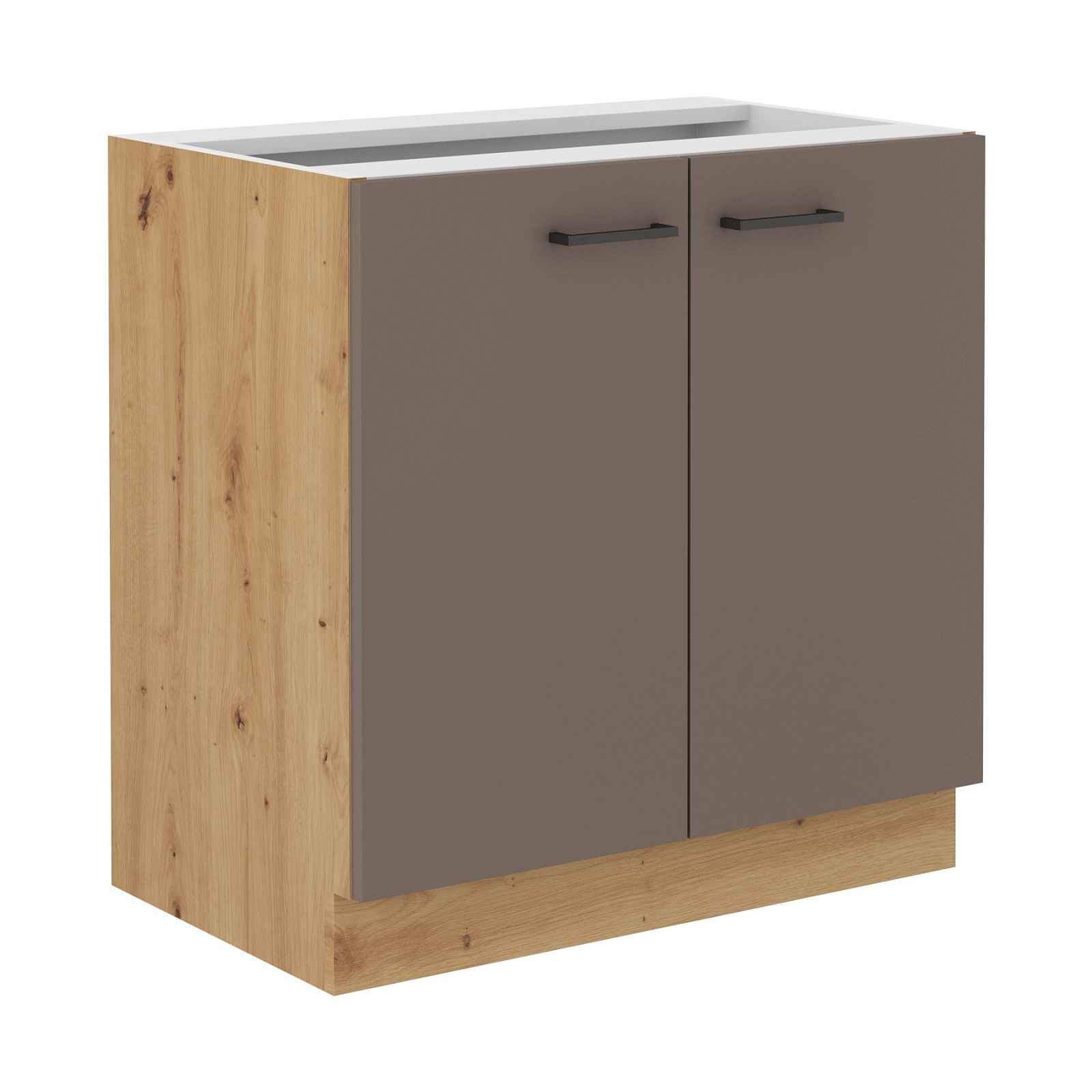 Skříňka dolní 80 cm Vlastnosti skříňky: - má jednu polici - má systém tichého dovírání dvířek - je bez pracovní desky - úchytky lze namontovat horizontálně nebo vertikálně Barva: - korpus: dub artisan - dvířka: lanýžově šedá - úchyt: černá Rozměry (šxvxh): 80 x 82 x 52 cm Materiál: - korpus: lamino, melaminové hrany, záda korpusu HDF - dvířka: lamino, ABS hrany - úchyt: plast Dodáváno v demontu.