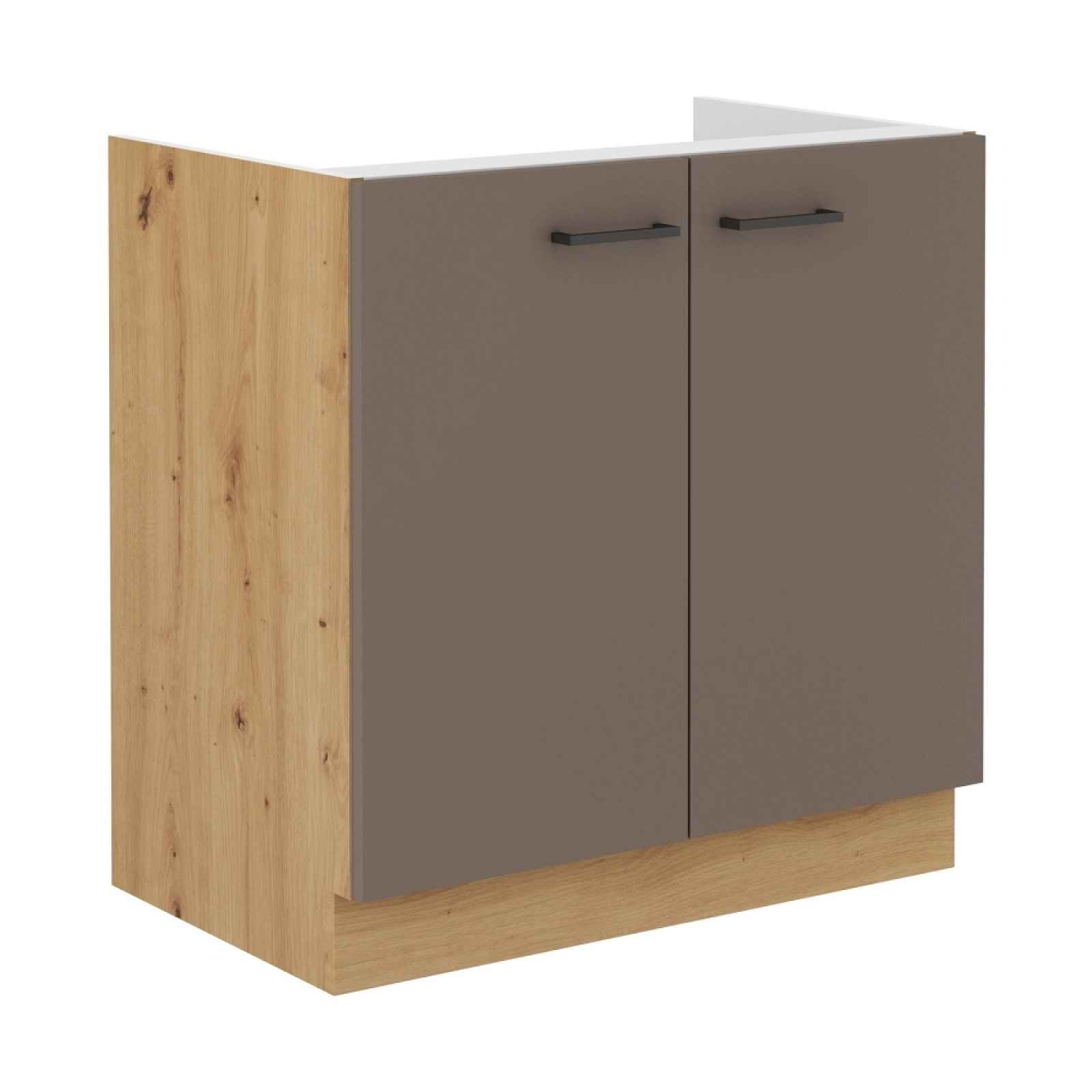 Skříňka pod dřez 80 cm Vlastnosti skříňky: - má systém tichého dovírání dvířek - je bez pracovní desky - úchytky lze namontovat horizontálně nebo vertikálně Barva: - korpus: dub artisan - dvířka: lanýžově šedá - úchyt: černá Rozměry (šxvxh): 80 x 82 x 52 cm Materiál: - korpus: lamino, melaminové hrany, záda korpusu HDF - dvířka: lamino, ABS hrany - úchyt: plast Dodáváno v demontu.