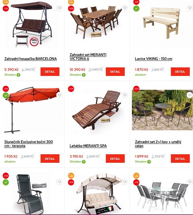 Mimo vybavení do interiéru v tomto internetovém obchodě pořídíte také zahradní nábytek. Zpříjemněte si vaše chvilky pohody na zahradě se stylovým nábytkem! V nabídce najdete praktické a odolné stoly a židle, pohodlné lavice, lehátka, houpací sítě a samozřejmě také altánky a domky, slunečníky a další praktické vychytávky.