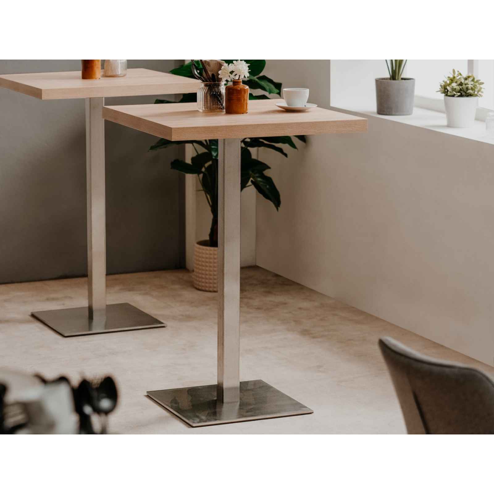 Čtvercový barový stůl 70x70 cm s horní plochou v dřevodekoru dub sonoma a stabilní kovovou podnoží v broušeném nerezovém provedení. Čtvercový barový stůl o velikosti 70x70 cm v univerzálním stylu se hodí do každého moderního interieru. Horní plochu v dřevodekoru dub sonoma doplňuje stabilní kovová podnož v broušeném nerezovém provedení. - materiál: laminovaná dřevotříska 43 mm (ABS hrany), kov - podnož: kov, broušená nerez, 45x1x45 cm - středová noha: kov, broušená nerez, profil 6x6 cm - zesílená jídelní deska s ABS hranou - dekor jídelní plochy: dub sonoma - rozměry jídelní plochy: 70x70 cm - univerzální styl - stabilní konstrukce - dodáváno v demontu