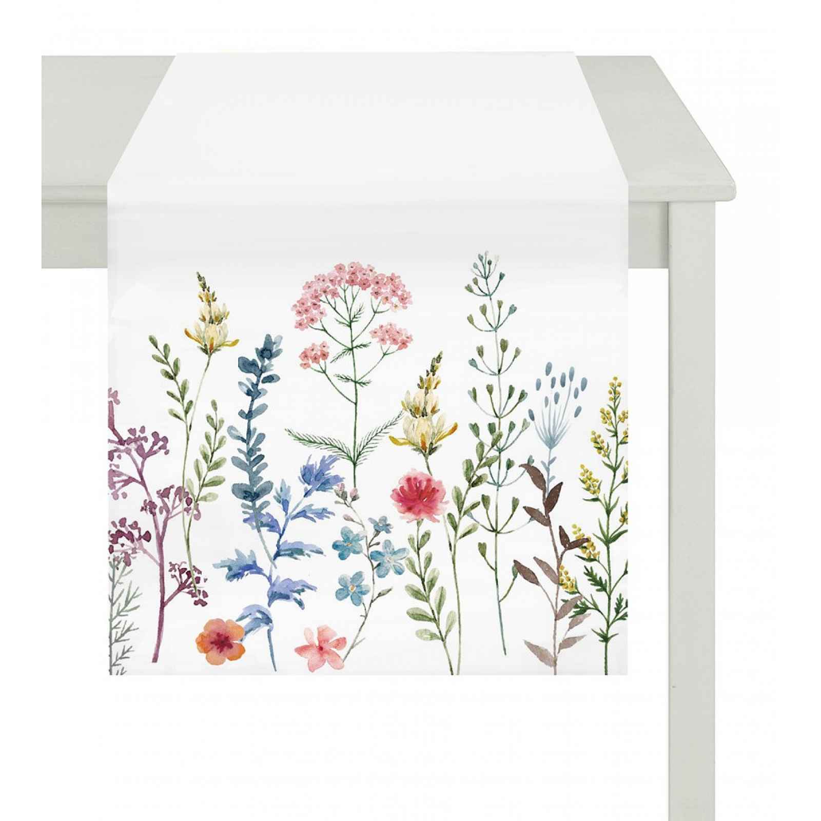 Oživte svůj stůl elegantním běhounem, který na rozdíl od ubrusu zakryje jen prostřední část stolové desky. Bílý běhoun s motivem lučních květů je nejen krásný, ale také poskytne částečnou ochranu před poškrábáním. Rozměr 40x150 cm. - rozměry: 40x150 cm - materiál 100% polyester - barva: bílá - motiv: luční květy - lze prát v pračce na 30°C