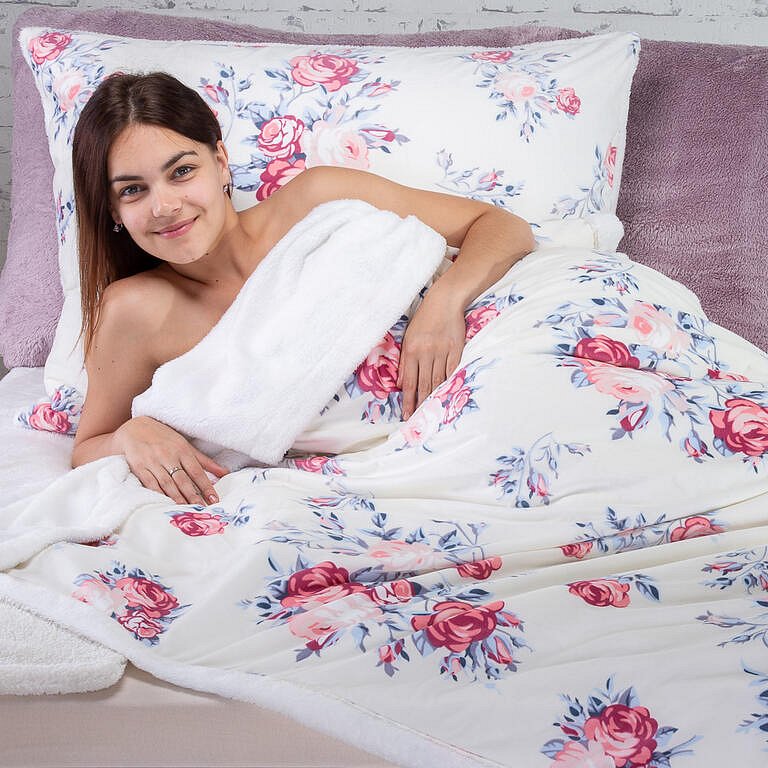Hebký materiál, co hřeje Souprava obsahuje: oboustranný povlak na polštář 70 x 90 cm podložku 90 x 200 cm oboustrannou přikrývku 140 x 200 cm (pokud ji v létě povléknete, získáte lehkou a příjemnou deku). Zachumlejte se do heboučké náruče lehké a hřejivé beránkové soupravy ROSABELLA, která dokonale zahřeje i ty největší zmrzlíky. Je zhotovena z měkkého a hřejivého mikrovlákna imitujícího pravé beránčí rouno, perfektně izoluje teplo a okamžitě zahřívá. Tento moderní materiál je antibakteriální a antialergický, odpuzuje roztoče, snadno se pere a udržuje. Přikrývka i povlak na polštář jsou dvojvrstvé – z jedné strany je hebce sametový mikroplyš s dekorem růží, ze strany druhé čistě bílá imitace ovčího rouna SHERPA s vysokým vlasem. Okraje přikrývky jsou zakončeny pružným ozdobným stehem, takže se nevytahují a dobře drží tvar. Povlak na polštář se zapíná na zip. Doporučujeme prát při teplotě do 40 °C pracím prostředkem na jemné barevné prádlo bez obsahu bělidel a používat antistatickou aviváž SLEEP WELL.