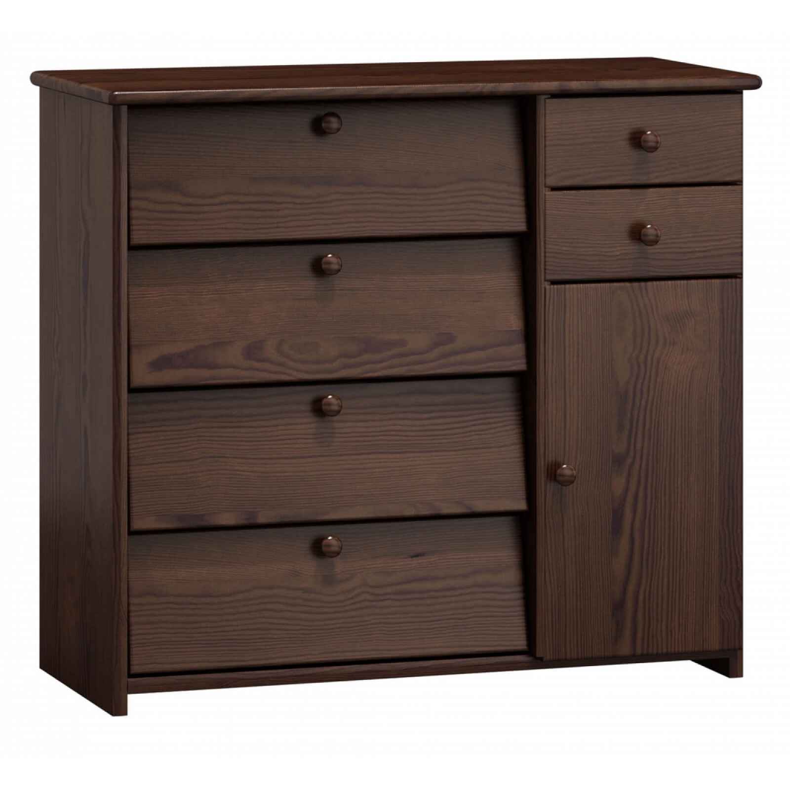 Botník se čtyřmi výklopy, dvěma zásuvkami a skříňkou Materiál: masiv borovice Barva moření: ořech Rozměry (výška x šířka x hloubka): 80 x 90 x 40 cm Dodáváno v demontu.