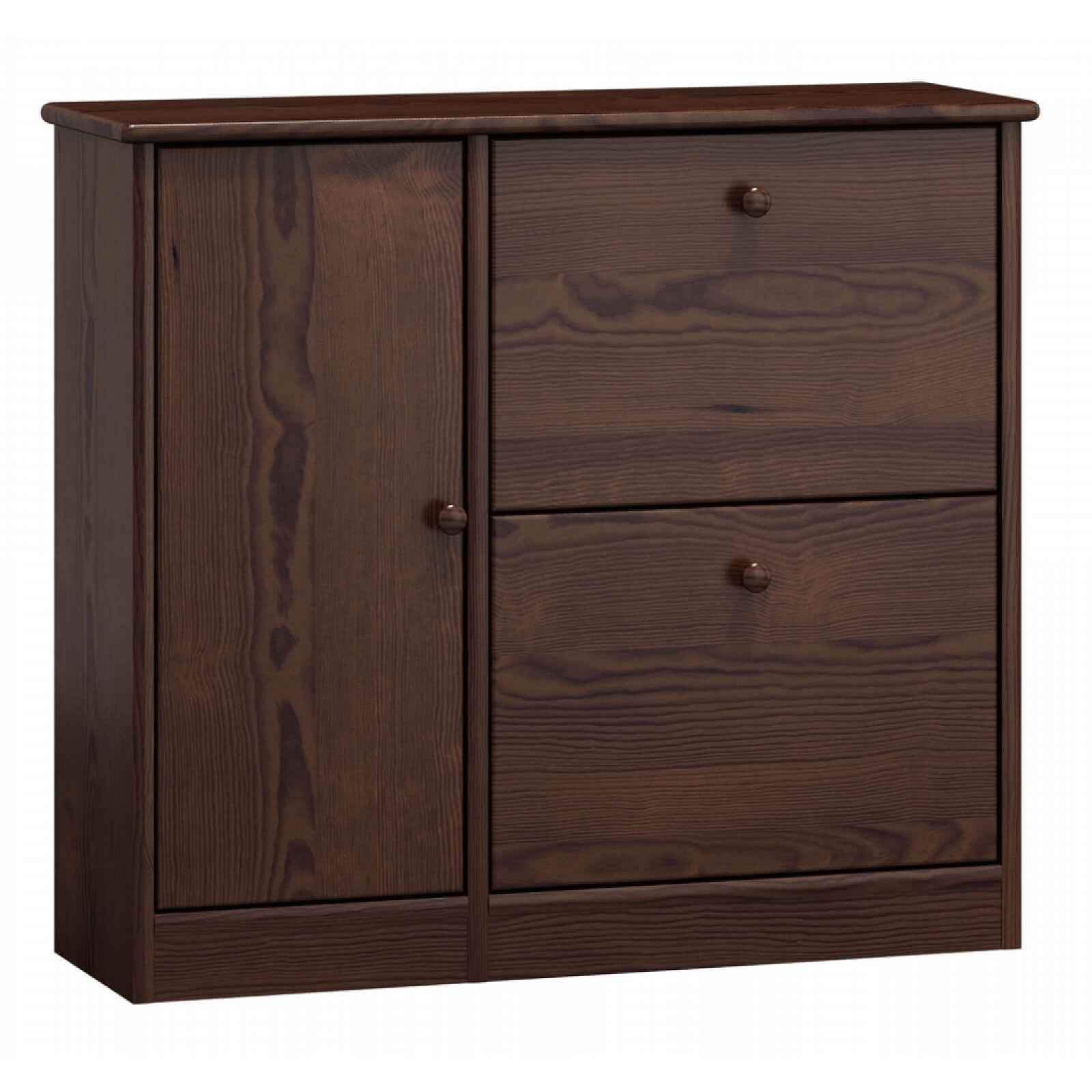 Botník se skříňkou a dvěma výklopy Materiál: masiv borovice Barva moření: ořech Rozměry (výška x šířka x hloubka): 80 x 90 x 29 cm Dodáváno v demontu.