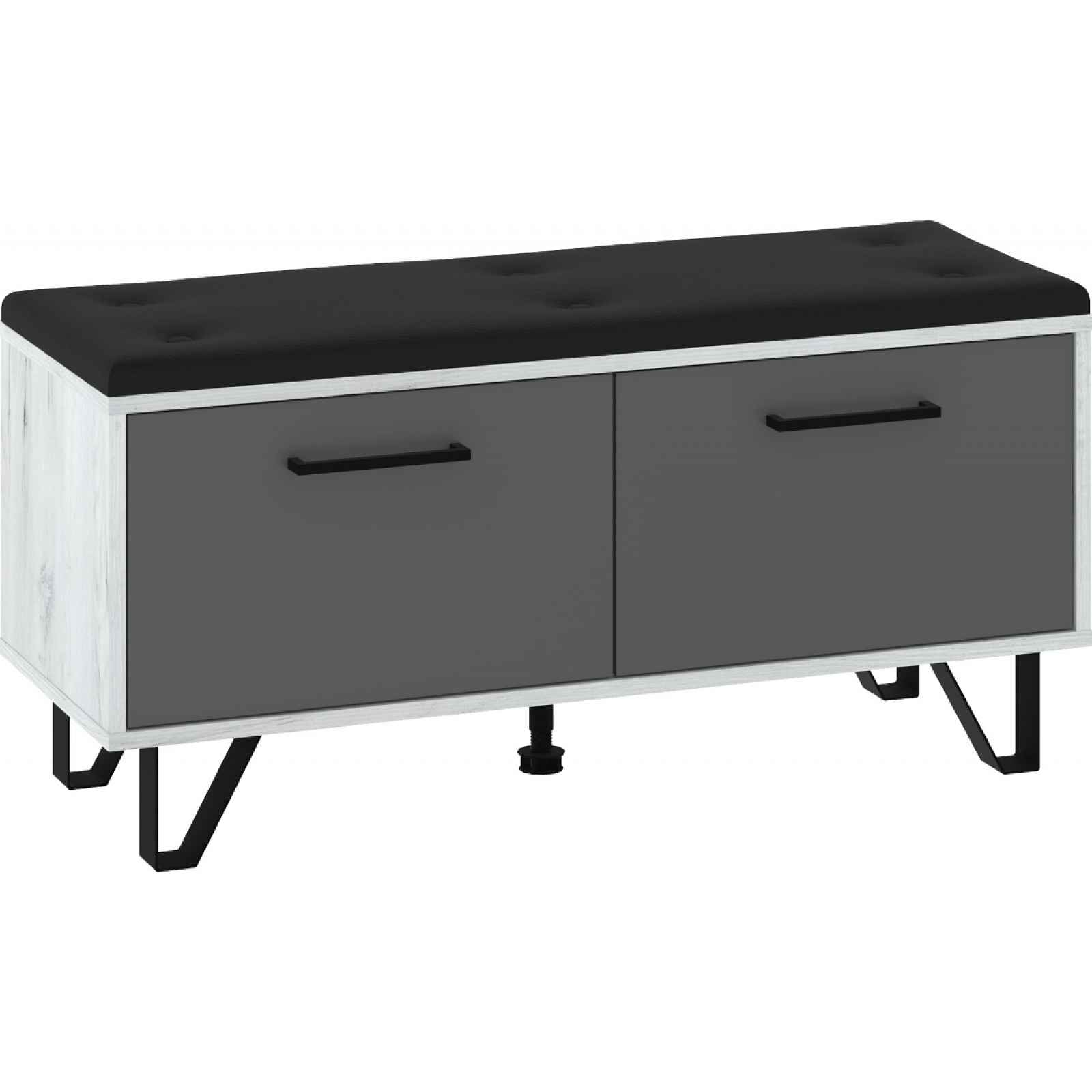 Policový botník s výklopnými dvířky a sedákem Barva: - craft bílý/grafit - nožky, úchytky a sedák: černá Rozměr (šxvxh): 100 x 48 x 39 cm Výška nožek: 12 cm Materiál: - lamino 16 mm, ABS hrany - sedák: ekokůže - nožky: kov Nosnost: max. 80 kg Disponuje systémem tichého dovírání. Dodáváno v demontu. Záruka 5 let.