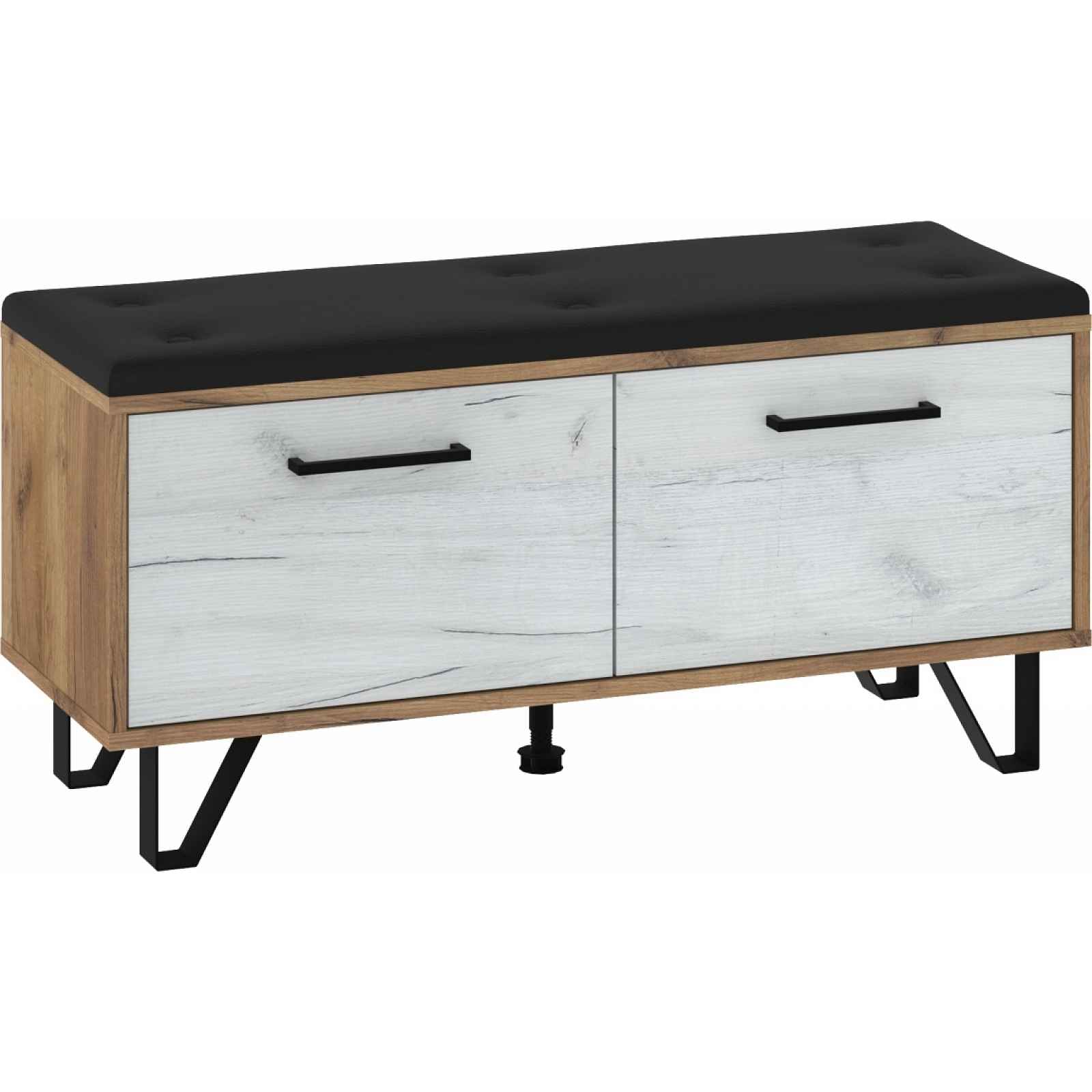 Policový botník s výklopnými dvířky a sedákem Barva: - craft zlatý/craft bílý - nožky, úchytky a sedák: černá Rozměr (šxvxh): 100 x 48 x 39 cm Výška nožek: 12 cm Materiál: - lamino 16 mm, ABS hrany - sedák: ekokůže - nožky: kov Nosnost: max. 80 kg Disponuje systémem tichého dovírání. Dodáváno v demontu. Záruka 5 let.