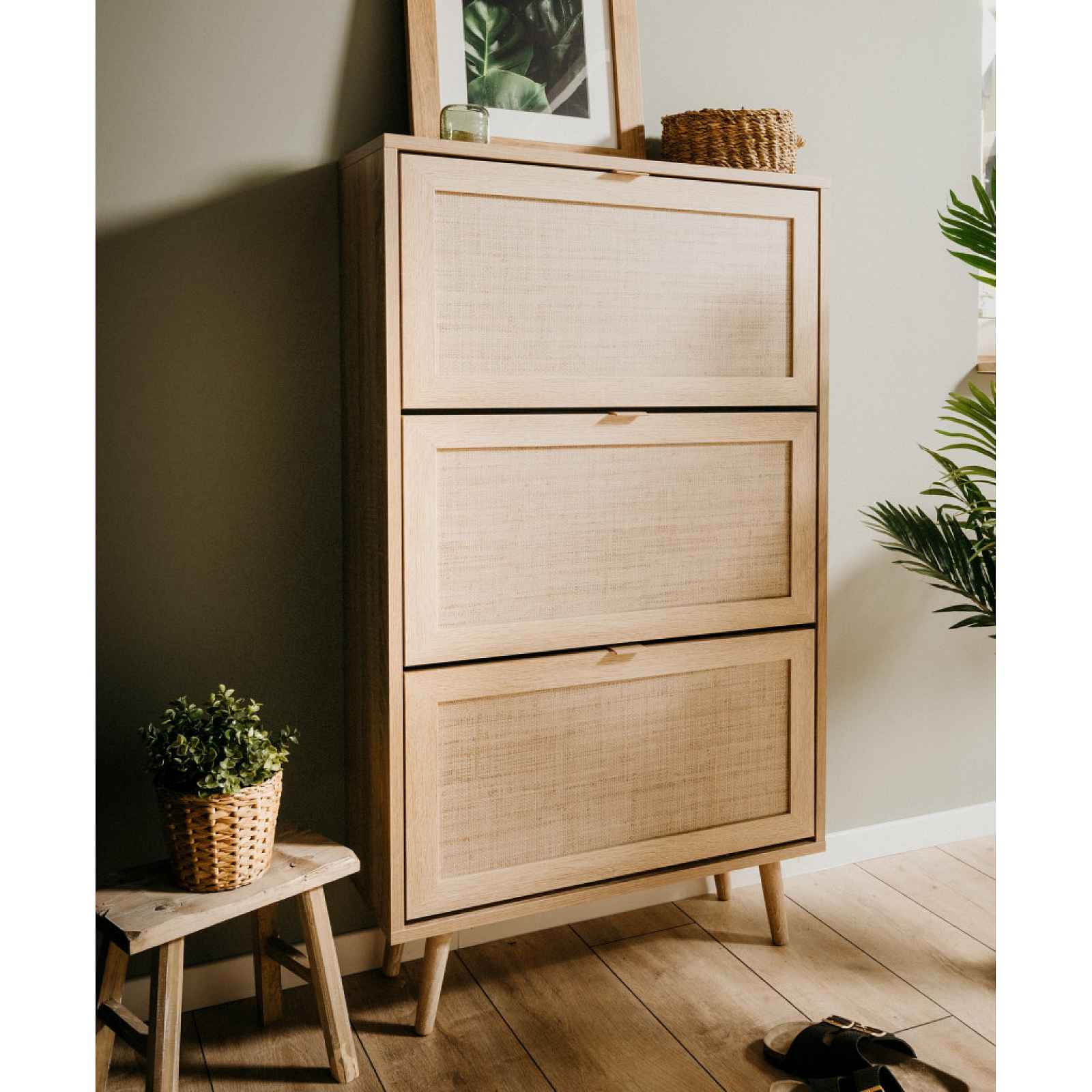 Botník Bali v dekoru dub sonoma s výklopnými dveřmi a imitací lýkového výpletu přináší přírodní styl, hřejivou atmosféru a masivní dřevěné nožky. Botník s výklopnými dveřmi z kolekce Bali - vytvořte si útulný a zároveň krásně zařízený domov v přírodním stylu. Atraktivní nábytek ve světlých tónech dřevodekoru dub sonoma spolu s úžasnou imitací lýkového výpletu dodá vašemu interieru příjemně hřejivou atmosféru. Stylový přírodní design nábytku podtrhují masivní dřevěné nožky, díky nimž můžete snadno udržovat podlahu v bytě. - botník s výklopnými dveřmi z kolekce Bali - materiál: laminovaná dřevotříska 16 mm/18 mm, MDF 16 mm, kov, plast - dekor korpus: dub sonoma - dekor přední plochy: dub sonoma/potisk imitace přírodního lýkového výpletu - úchyt: plast, imitace dub sonoma - nohy: masivní dřevo – dub, kónický tvar (výška 16 cm) - útulný přírodní styl - šířka: 70 cm - 3 x výklopné dveře (uvnitř 3×2 úložná přihrádka na boty) - zadní 1-bodové ukotvení ke stěně - stabilní - dodáváno v demontu
