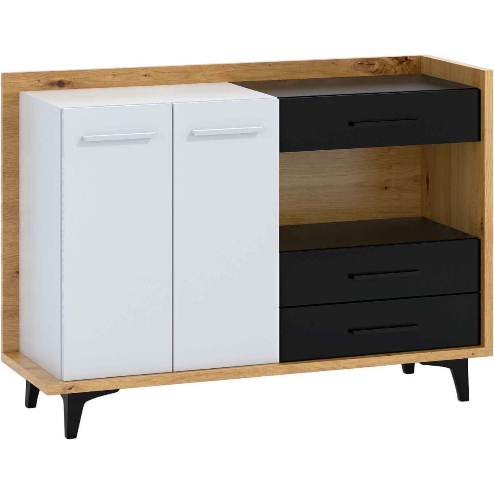 Komoda s dvířky a zásuvkami Barva: dub artisan/bílá/černá Rozměr (šxvxh): 125 x 91 x 42 cm Výška nožek: 12 cm Materiál: kombinace kvalitního lamina o tloušťce 16 a 25 mm, hrany jsou chráněny ABS Zásuvky mají kovové pojezdy opatřené tichými dojezdy. Dodáváno v demontu. Záruka 5 let.