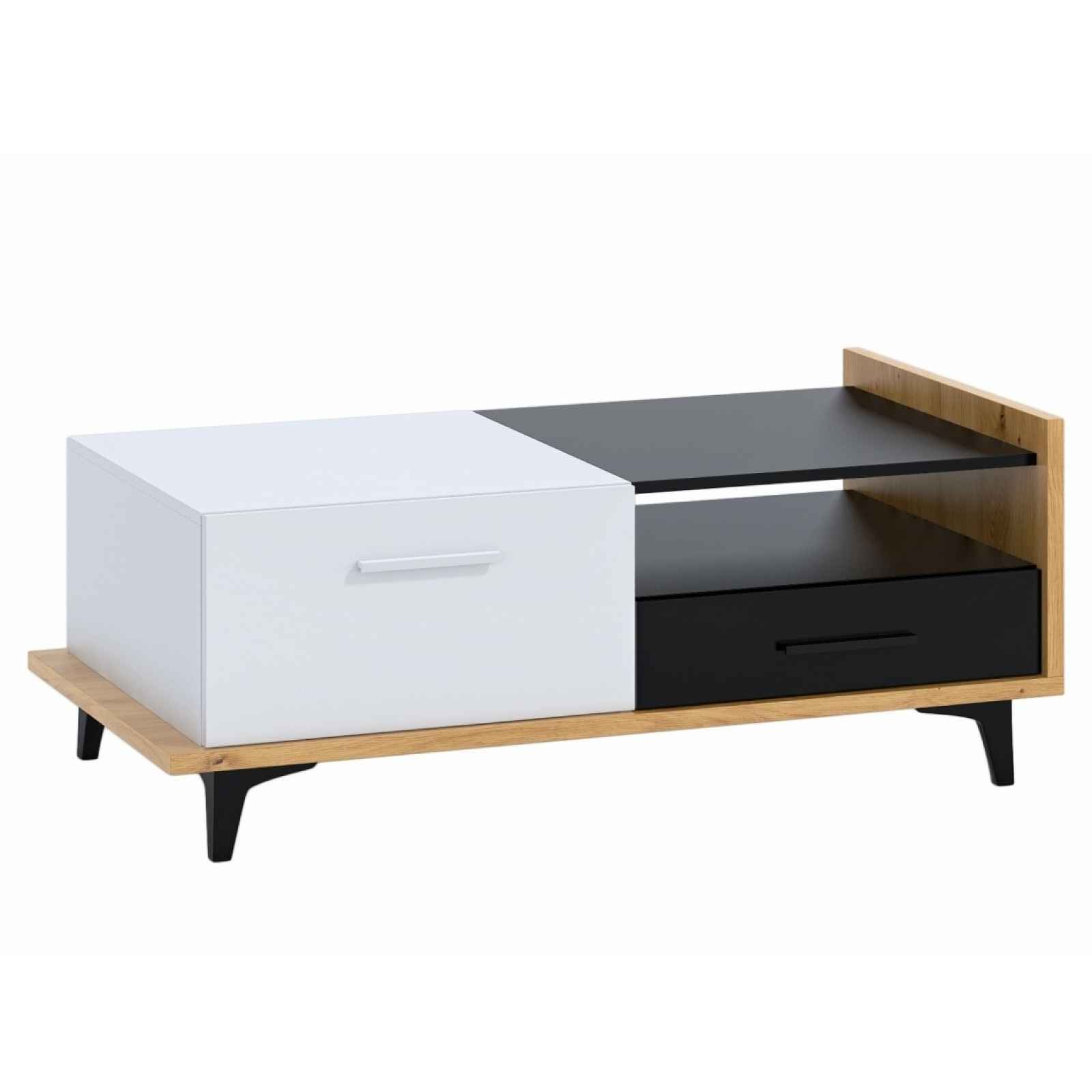 Konferenční stolek se dvěma výklopnými dvířky a dvěma zásuvkami Stolek má zásuvku a dvířka z každé strany, proto je vhodné umístit konferenční stolek do prostoru. Barva: dub artisan/bílá/černá Rozměr (šxvxh): 125 x 49 x 66 cm Výška nožek: 12 cm Materiál: kombinace kvalitního lamina o tloušťce 16 a 25 mm, hrany jsou chráněny ABS Zásuvky mají kovové pojezdy opatřené tichými dojezdy. Dodáváno v demontu. Záruka 5 let.