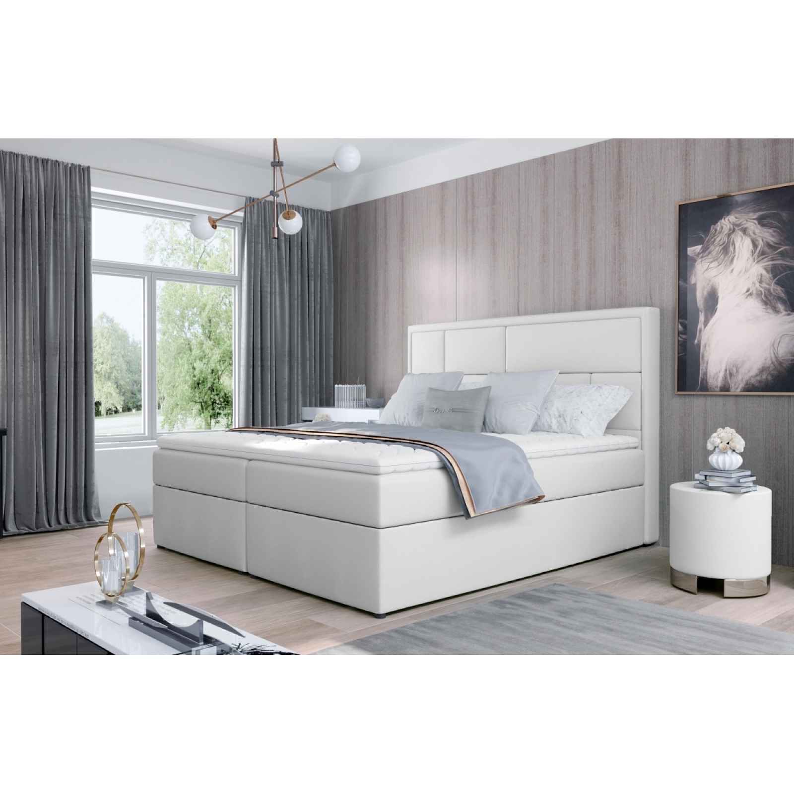 Postel boxspring 160x200 cm V ceně postele je topper.Postel má úložný prostor - viz fotografie. Další fotografie postele jsou pouze ilustrační (jiná barva)! Potahová ekokůže: Soft 17 = bílá Rozměry (šxhxv): 160 x 215 x 53/115 cm Ložná plocha (šxh): 160 x 200 cmMateriál: - bonellové pružiny - nožky vysoké 2 cm Dodání v demontu