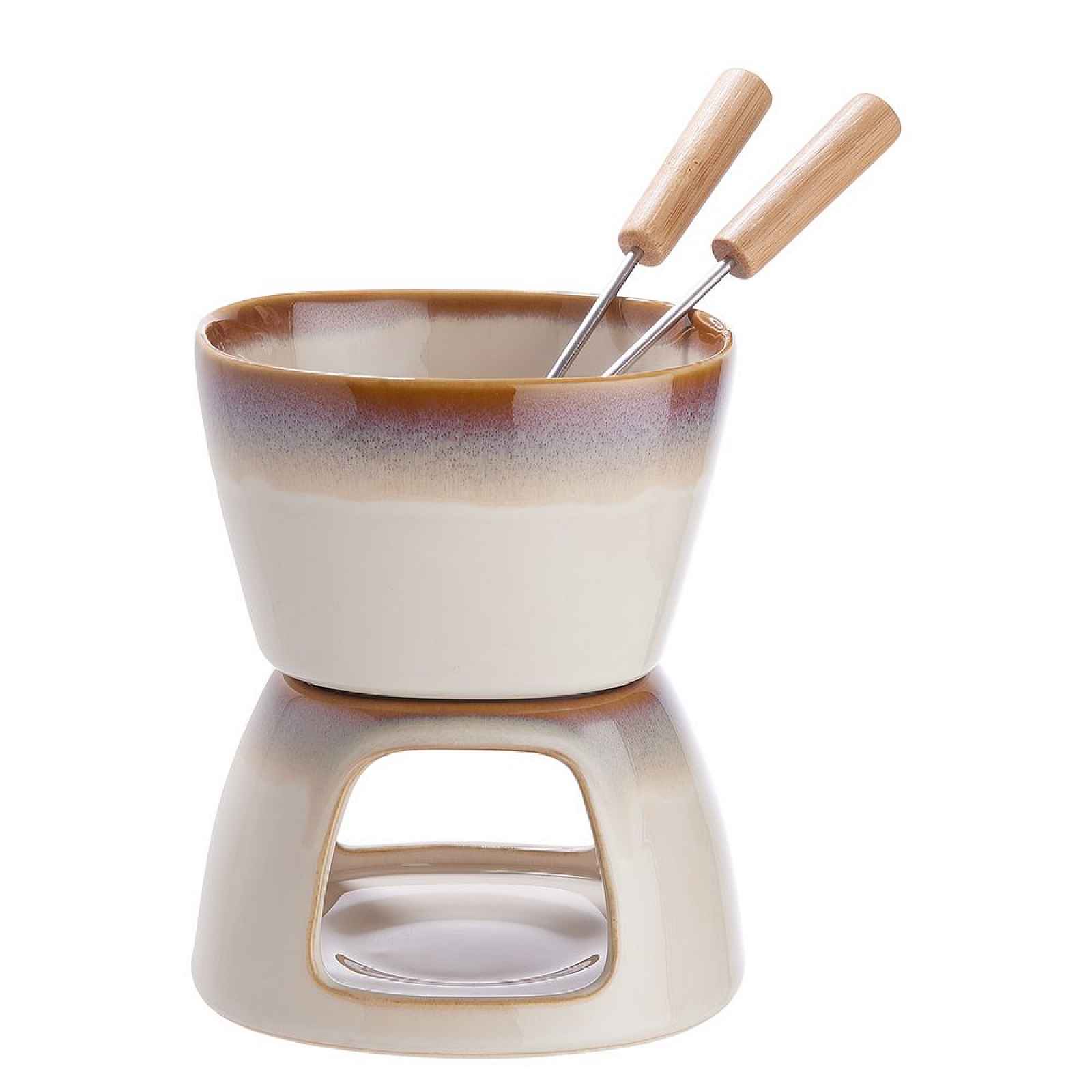 kameninové fondue lze mýt v myčce vidličky myjte ručně Ať už sami nebo ve dvojici, oslaďte si den čokoládou roztavenou v mini fondue AU CHOCOLAT vyrobeném z kameniny s reaktivní glazurou. Kulatý tvar a reaktivní glazura v béžové barvě dodávají fondue přirozený retro vzhled a součástí sady jsou samozřejmě také dvě vidličky z nerezové oceli a bambusu (ty jediné nelze mýt v myčce). Okamžitě dostanete chuť namáčet sušenky a kousky ovoce do tekuté čokolády.