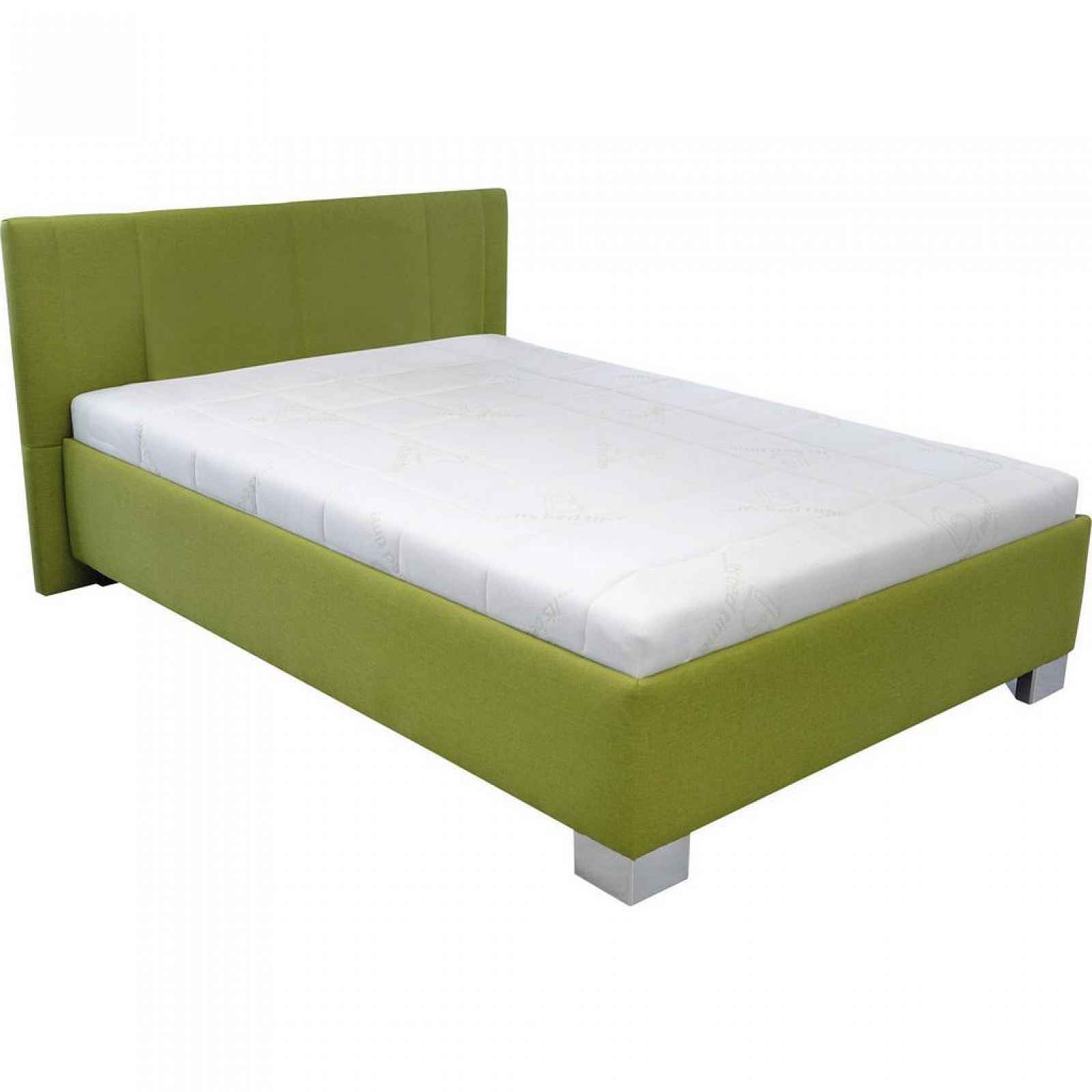 Čalouněná postel v zelené látce, s pevne čalouneným matracem, s lamelovým roštem, s nohama barvy chrómu, výška lehu: 51 cm, PL:140x 200cm, s max.nosností 105kg, Š/V/H:162/97/214cm
