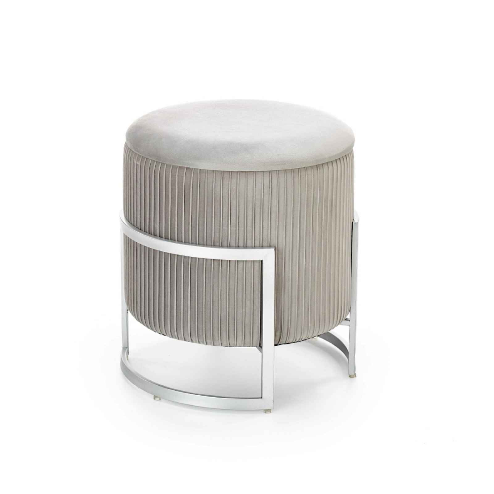 Čalouněný taburet s úložným prostorem Barva: světle šedá Materiál: lakovaná ocel / látka - velvet Rozměry: průměr 40 cm, výška 46 cm Dodáváno v demontu.