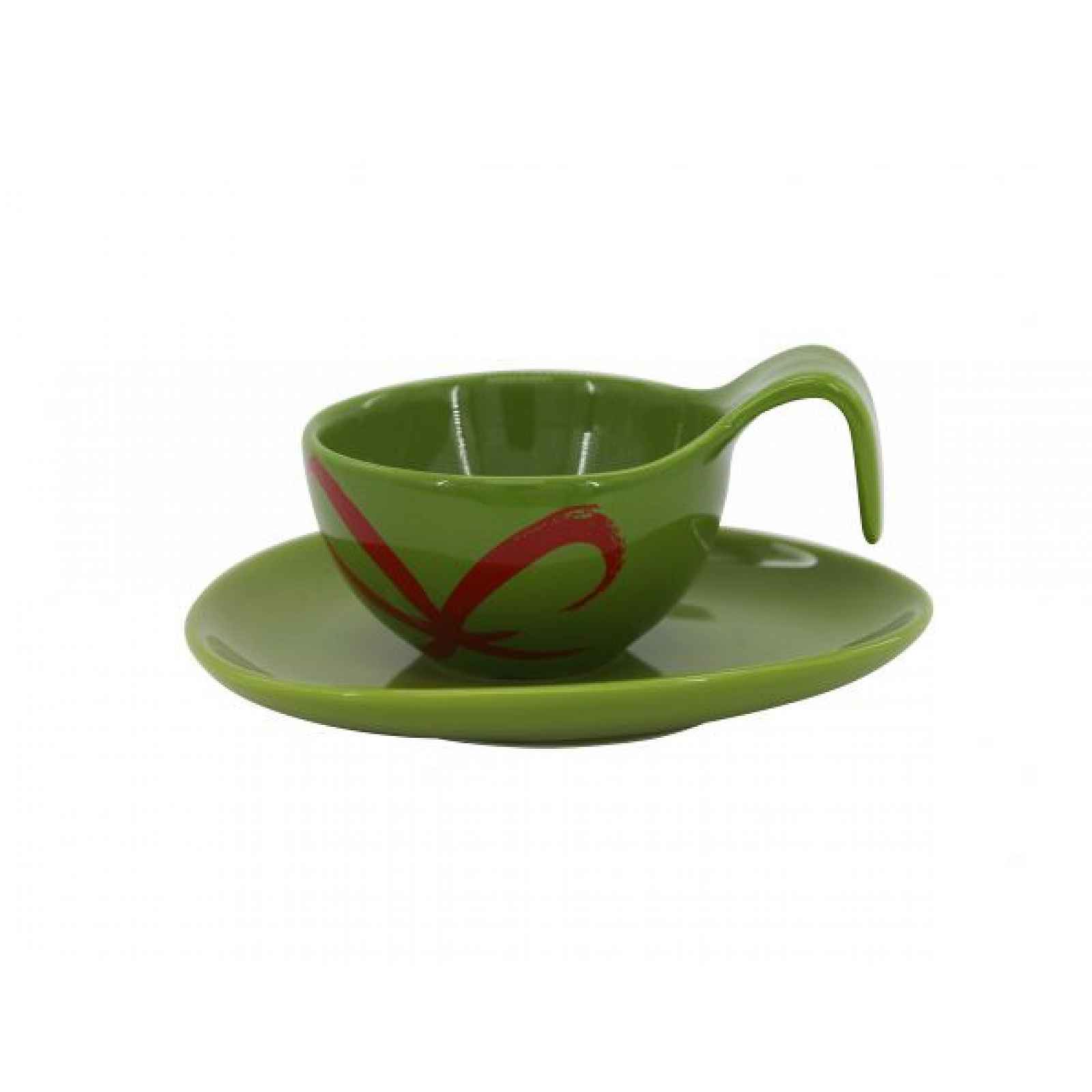Zelený keramický šálek s podšálkem na cappuccino, čaj nebo kávu o objemu 150ml. Hrnek má dekor z červených mašliček. Vlastnosti: Hmotnost: 0,351 kg Barva: bílá / zelená Materiál: keramika Objem: 150 ml