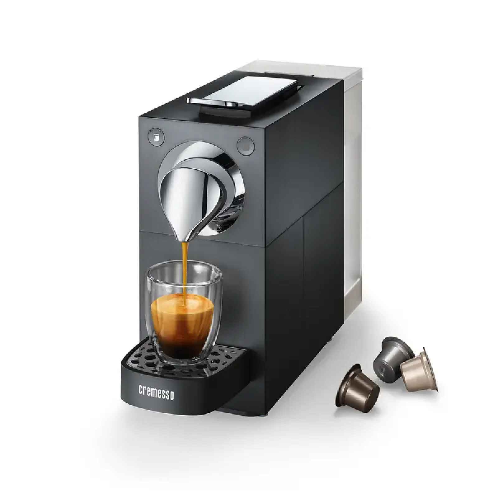 Elegantní kompaktní kapslový kávovar Cremesso UNA v nadčasové černé barvě s 19barovou technologii, úsporným režimem provozu a možností naprogramování dvou objemů šálků.Připraven během chvilky: přechod z režimu "stand by" do režimu "ready" za 15 sekund19barová technologie pro profesionální přípravu kávy s výraznou chutíJednoduché ovládání: jen 2 tlačítka s možností nastavení objemu šálku