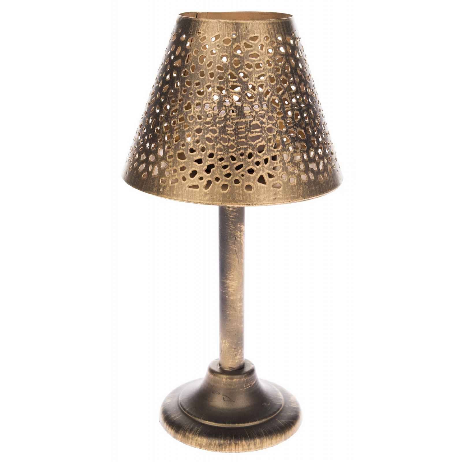 Kovový svícen ve tvaru lampy na čajovou svíčku se stane zároveň originální dekorací. Měděný svícen ve vintage optice společně se svíčkou vykouzlí příjemnou světelnou atmosféru a zajistí Vám tak romantické chvíle. - svícen na čajovou svíčku - materiál: kov - barva: měděná - vintage optika - horní část lze sundat a snadno tak zapálit svíčku - plamen svíčky skrz otvory vytváří krásné světelné efekty - ideální dekorace na stůl, poličku, komodu - výška: 20 cm