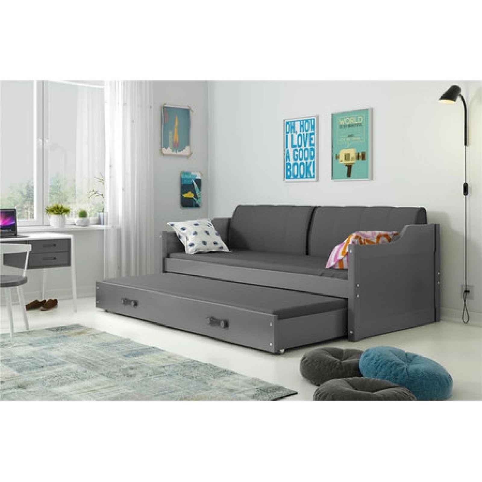 Dětská pohovka David s výsuvným lůžkem 90x200 cm - grafit. Postel je vyrobena z masivní borovice. S ohledem na děti je veškerý sortiment vyroben z ekologicky nezávadného materiálu. - výsuvné lůžko na kolečkách, pro snadnou manipulaci - dřevěné rošty - pěnové matrace s lehce snímatelným potahem, který lze prát v pračce - výška matrací je 7 cm - rozměry matrací: 80x190 cm, 90x200 cm Údržba: Povrch nábytku utřete do čista měkkým hadříkem. Vyhněte se použití chemikálií.