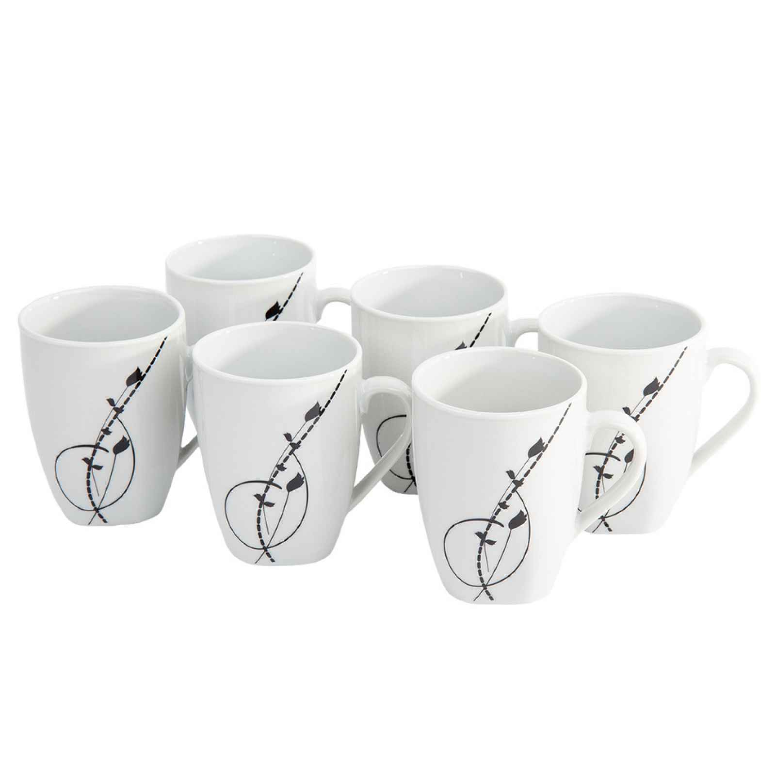 Kvalitní porcelán s černým dekorem. Můžete libovolně kombinovat různé typy sad dle vlastních přání, např. pouze hrnky s miskami a dezertními talířky. S tímto nadčasovým dekorem si zpříjemníte každé stolování. Hrnky jsou vhodné do myčky i mikrovlnné trouby.
