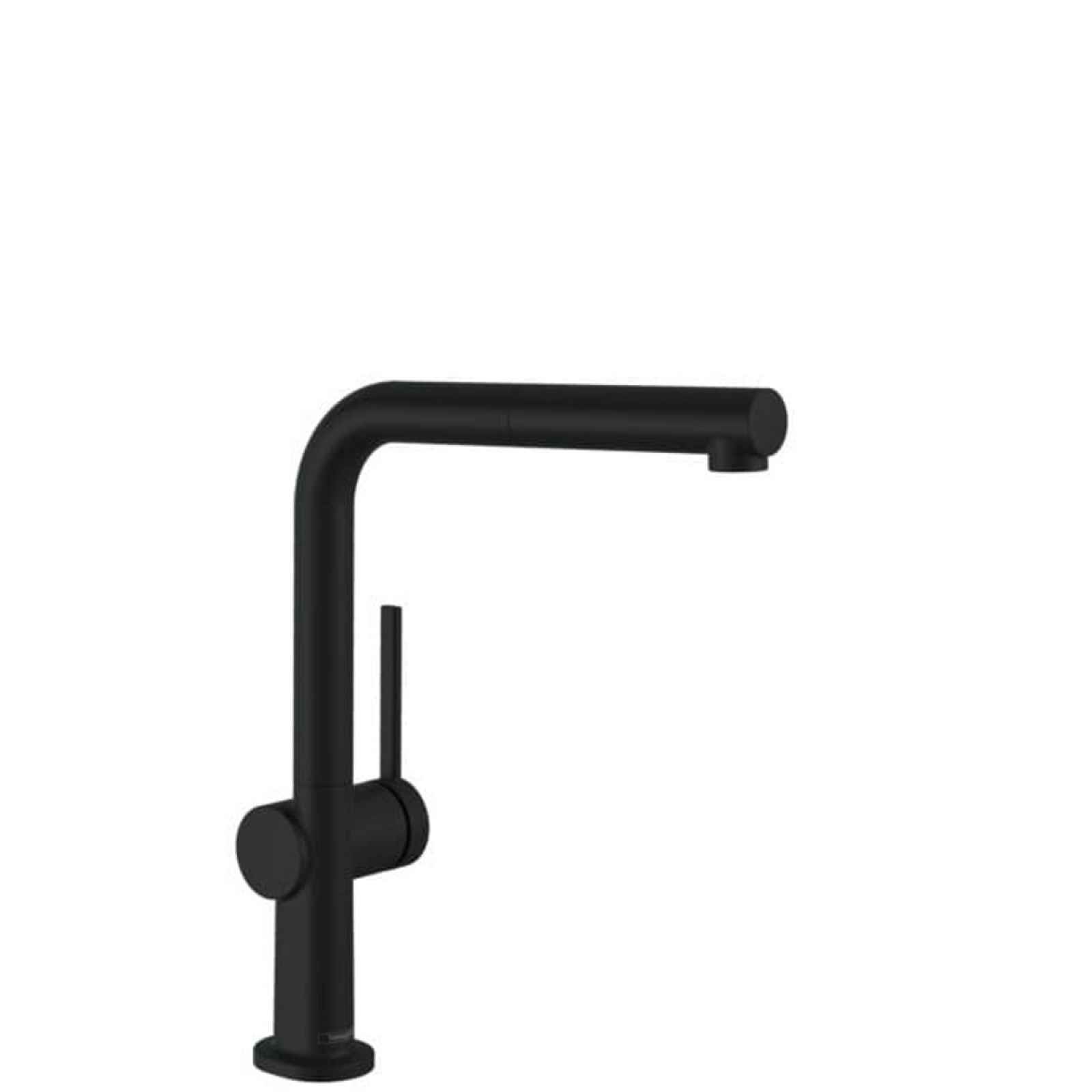 Páková stojánková dřezová baterie s vytahovací sprškou. V kulatém designu. V černém matném provedení. Průtok baterie je 4,9 litrů/minutu. Výška baterie je 29,6 cm. Ramínko je ve výšce 26,5 cm. S matným povrchem.