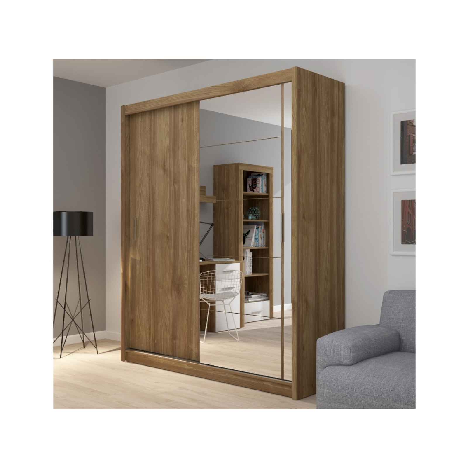 Skříň s posuvnými dveřmi a zrcadlem Barva: korpus – ořech Rozměry (šxhxv): 180 x 61 x 216 cm Materiál: lamino Dodání v demontu. Záruka 24 měsíců.