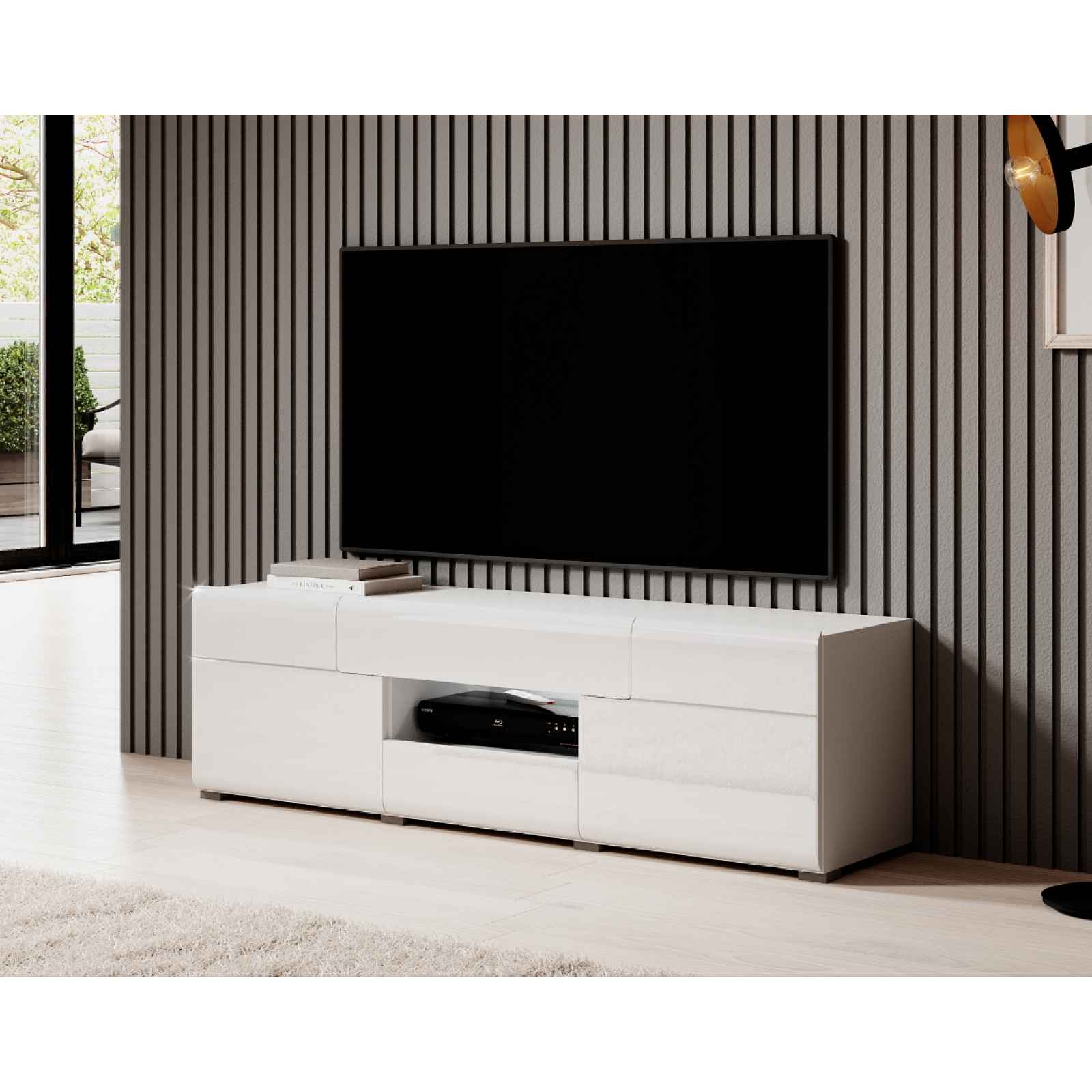 Televizní stolek Barva: bílá/bílý lesk Rozměry (šxhxv): 159 x 39 x 48 cm Materiál: lamino Možnost dokoupit osvětlení. Dodání v demontu.