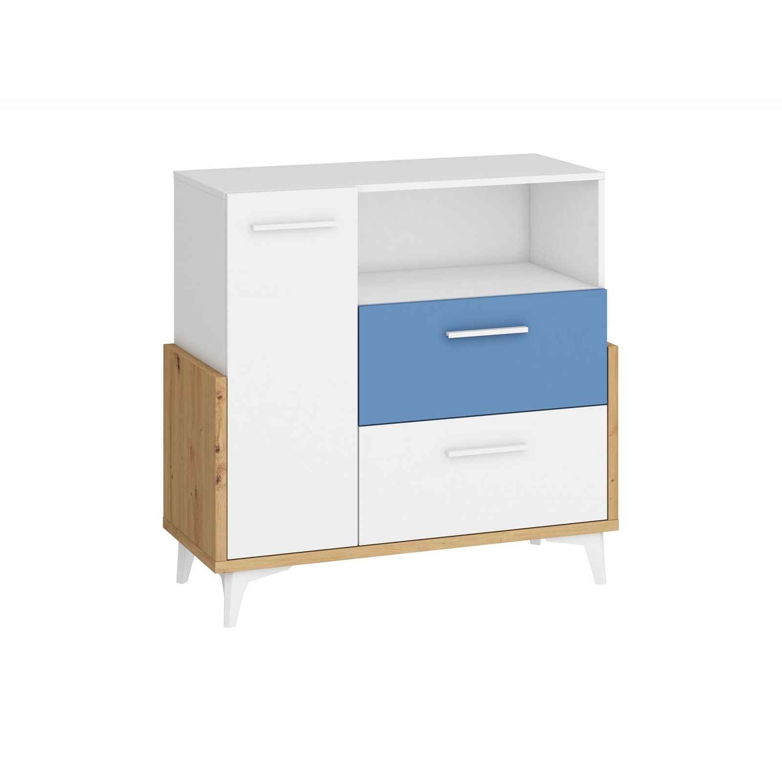 Komoda je vybavena dvěma prostornými zásuvkami, policovým prostorem a skříňkou se dvěma poličkami uvnitř. Barva: - dub artisan/bílá/modrá - nožky a úchytky: bílá Rozměr (šxvxh): 95 x 93 x 42 cm Výška nožek: 12 cm Materiál: lamino - korpusy mají sílu 25 mm - dvířka a ostatní části mají sílu 16 mm - nožky: tvrzený plast Zásuvky i dvířka mají systém tichého dovírání. Dodáváno v demontu. Záruka 5 let.