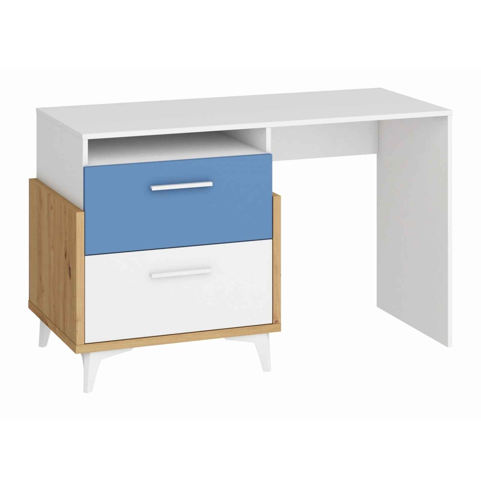 Psací stůl se dvěma velkými zásuvkami Barva: - dub artisan/bílá/modrá - nožky a úchytky: bílá Rozměr (šxvxh): 125 x 76 x 57 cm Výška nožek: 12 cm Materiál: lamino - korpusy mají sílu 25 mm - dvířka a ostatní části mají sílu 16 mm - nožky: tvrzený plast Zásuvky mají systém tichého dovírání. Dodáváno v demontu. Záruka 5 let.