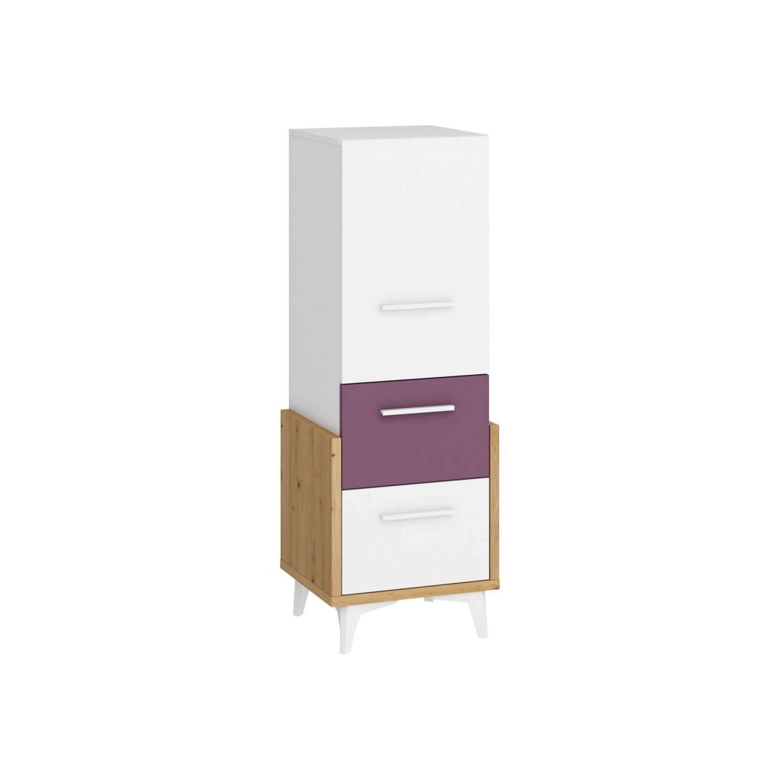 Skříň má dvě zásuvky a skříňku s poličkou uvnitř Barva: - dub artisan/bílá/fialová - nožky a úchytky: bílá Rozměr (šxvxh): 45 x 127 x 42 cm Výška nožek: 12 cm Materiál: lamino - korpusy mají sílu 25 mm - dvířka a ostatní části mají sílu 16 mm - nožky: tvrzený plast Zásuvky i dvířka mají systém tichého dovírání. Dodáváno v demontu. Záruka 5 let.
