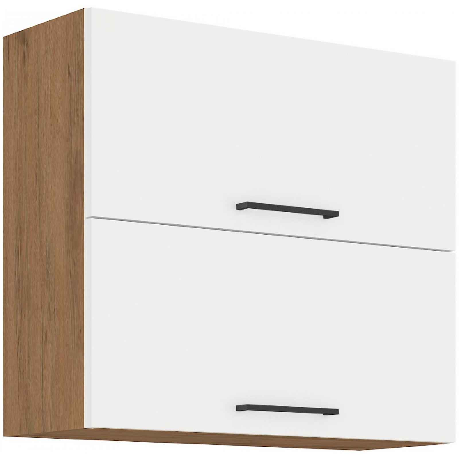 Horní kuchyňská skříňka o šířce 80 cm v provedení bílý vysoký lesk a dub lancelot z kuchyňského programu Vigo. Kuchyni lze snadno naplánovat z pohodlí vašeho domova s možností kombinace elementů mezi sebou. - horní kuchyňská skříňka z programu Vigo - materiál: laminovaná dřevotříska 16 mm (ABS hrany přední plochy) - dekor korpus: dub lancelot - dekor přední plochy: bílý vysoký lesk/dub lancelot - úchyt: hranatý plastový profil (19,6 cm), šedá alu barva - pro zavěšení na stěnu (zadní 2-bodové zavěšení) - 1 x horní výklopné dveře (plynové písty, úložný prostor) - 1 x dolní výklopné dveře (plynové písty, úložný prostor) - dodáváno v demontu