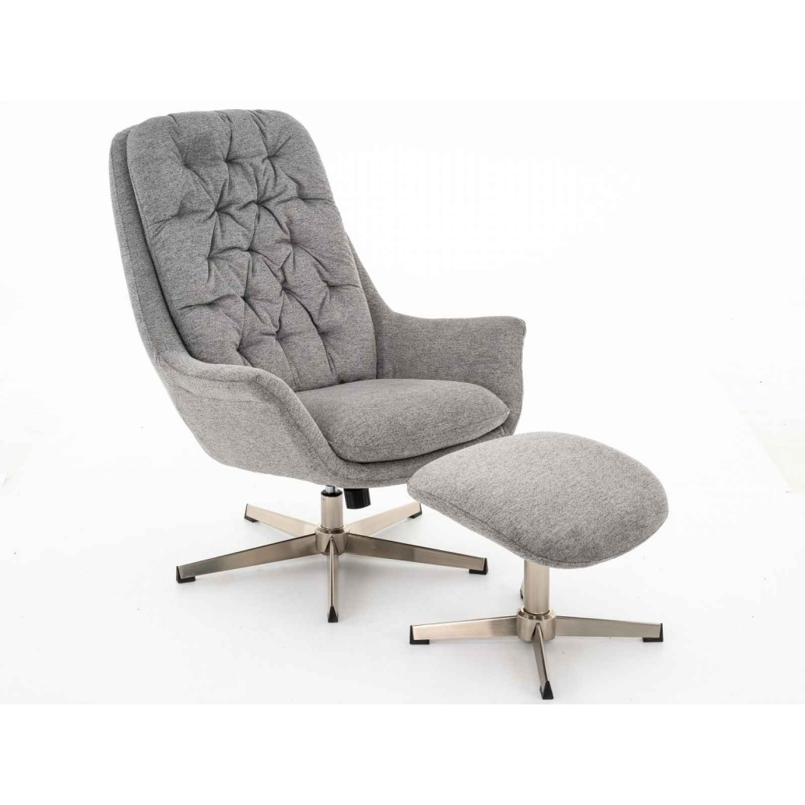 Houpací křeslo s podnožkou je očalouněno holubí šedou látkou a doplněno stylovým proševem. Poskytne pohodové posezení během každého dne. Sedák má otočný o 360 stupňů a taburet pod nohy doplňuje příjemný relax. Kovová podnož v broušené optice poskytuje křeslu potřebnou stabilitu během každodenního využívání. - křeslo + podnožka - stabilní 5-ramenná základna - konstrukce: kov, dřevovláknitá deska - povrchová úprava: broušený kov - jádro: polyuretanová pěna - potah: látka CR147-11 – jemně strukturovaná žinilková látka, barva holubí šedá - včetně potažení zadní části - okrasný zádový zip - okrasné prošití potahu opěradla - sedák: středně měkký - opěrák: středně měkký, pohodlný tvar - vyšší opěradlo = pohodlné opření oblasti krku/hlavy - boční područky - zaoblené tvary - sedák otočný o 360° - houpací sedák (bez aretace) - podnožka – pro pohodlné opření nohou - pro pohodové sezení - doporučená nosnost křesla do 150 kg - doporučená nosnost podnožky do 20 kg - rozměry křesla: 76x100,5x91 cm - výška sedu: 43 cm - hloubka sedu: 48 cm - šířka sedu: 51 cm - rozměry podnožky: 46x37x41 cm - dodáváno v demontu