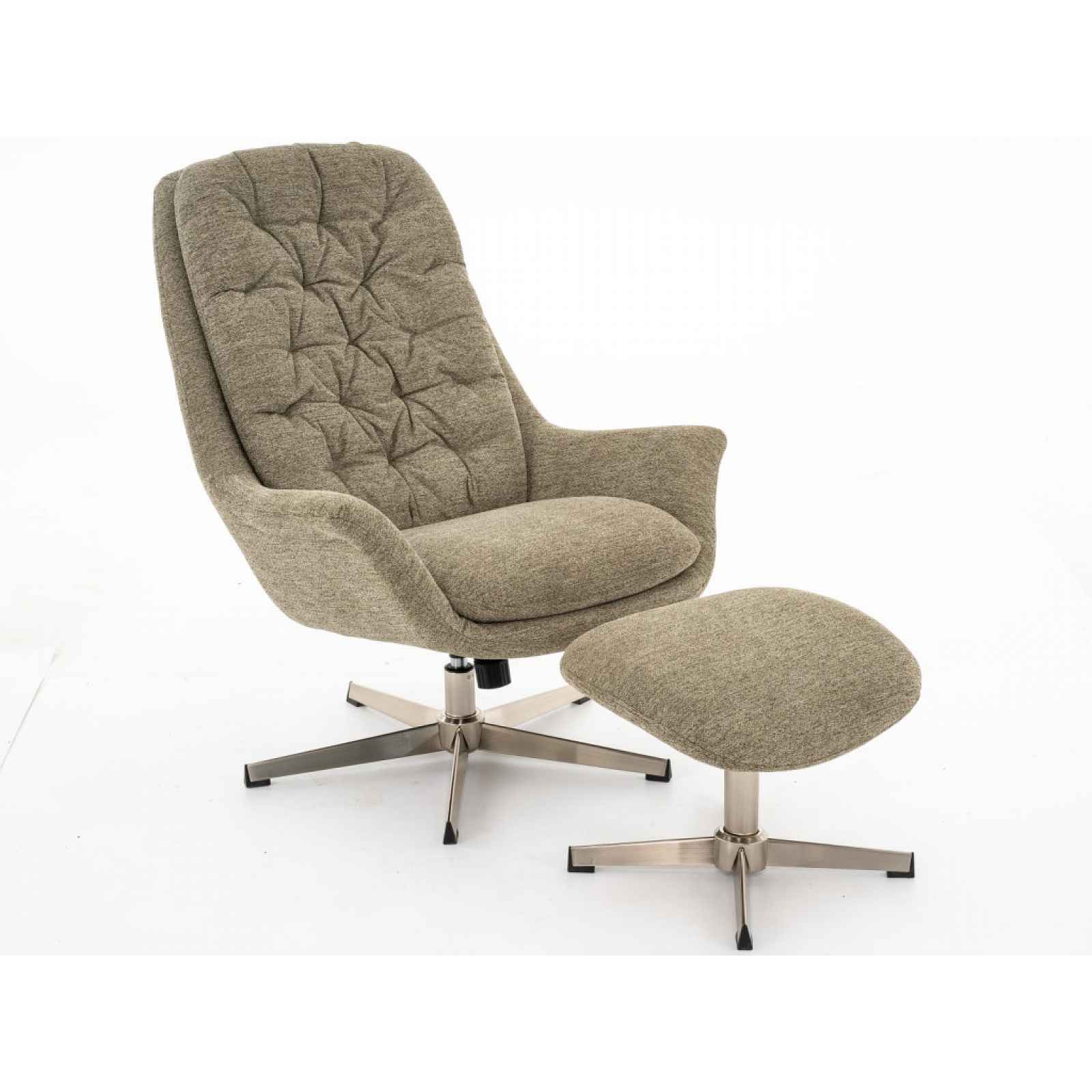 Houpací křeslo s podnožkou je očalouněno zelenou látkou a doplněno stylovým proševem. Poskytne pohodové posezení během každého dne. Sedák má otočný o 360 stupňů a taburet pod nohy doplňuje příjemný relax. Kovová podnož v broušené optice poskytuje křeslu potřebnou stabilitu během každodenního využívání. - křeslo + podnožka - stabilní 5-ramenná základna - konstrukce: kov, dřevovláknitá deska - povrchová úprava: broušený kov - jádro: polyuretanová pěna - potah: látka CR-147-5 – jemně strukturovaná žinilková látka, barva zelená - včetně potažení zadní části - okrasný zádový zip - okrasné prošití potahu opěradla - sedák: středně měkký - opěrák: středně měkký, pohodlný tvar - vyšší opěradlo = pohodlné opření oblasti krku/hlavy - boční područky - zaoblené tvary - sedák otočný o 360° - houpací sedák (bez aretace) - podnožka – pro pohodlné opření nohou - pro pohodové sezení - doporučená nosnost křesla do 150 kg - doporučená nosnost podnožky do 20 kg - rozměry křesla: 76x100,5x91 cm - výška sedu: 43 cm - hloubka sedu: 48 cm - šířka sedu: 51 cm - rozměry podnožky: 46x37x41 cm - dodáváno v demontu
