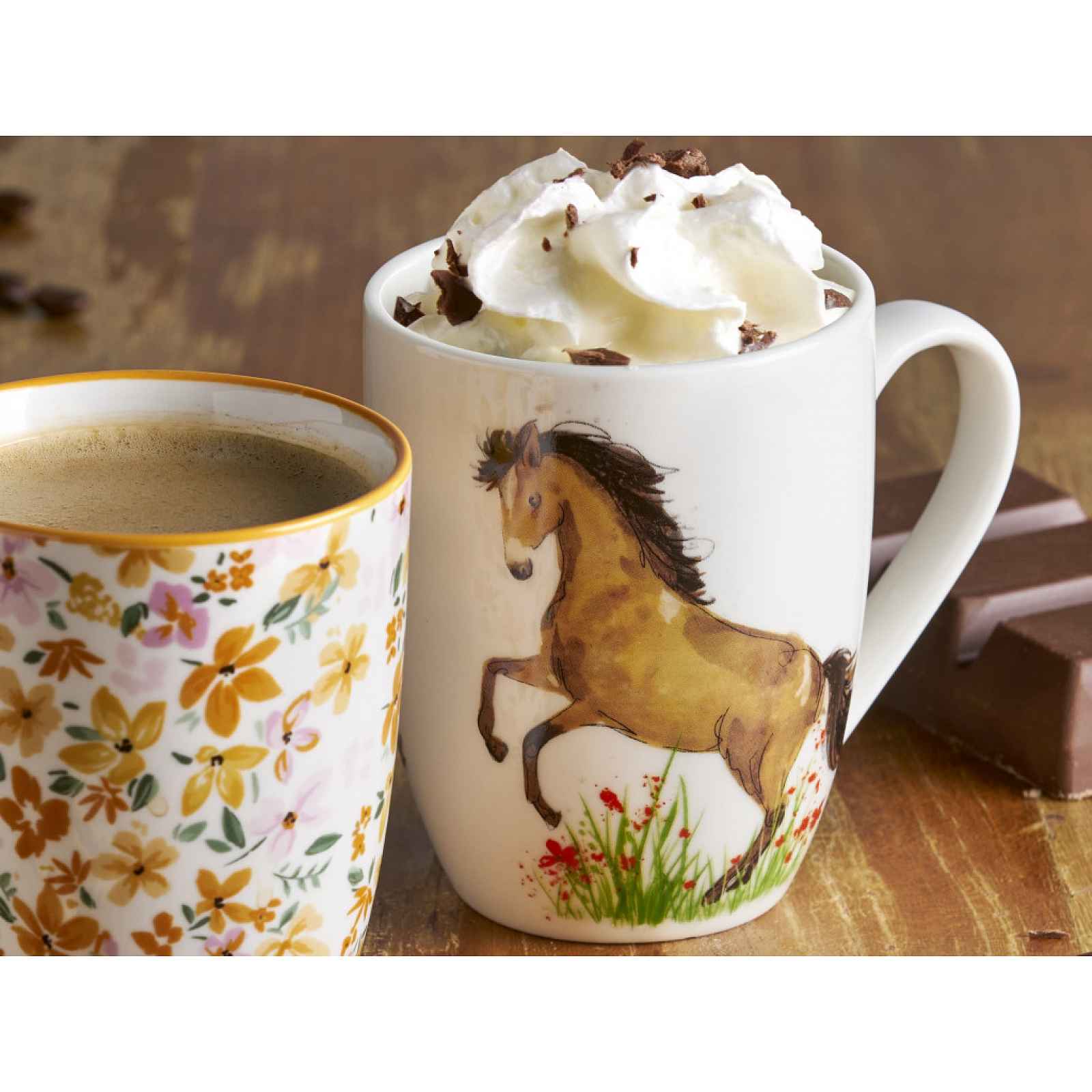 Hrnek o objemu 350 ml s akvarelovou ilustrací koně v pohybu potěší každého jezdce, chovatele i milovníka zvířat. Objem 350 ml. Hrnek o objemu 350 ml s akvarelovou ilustrací koně v pohybu potěší každého jezdce, chovatele i milovníka zvířat. Objem 350 ml je ideální pro každodenní pití kávy či čaje. - materiál: kamenina - objem: 350 ml - umělecký akvarelový motiv: kůň - pro každodenní používání - vhodné do myčky nádobí i mikrovlnné trouby - ideální na kávu, čaj, kakao a další nápoje