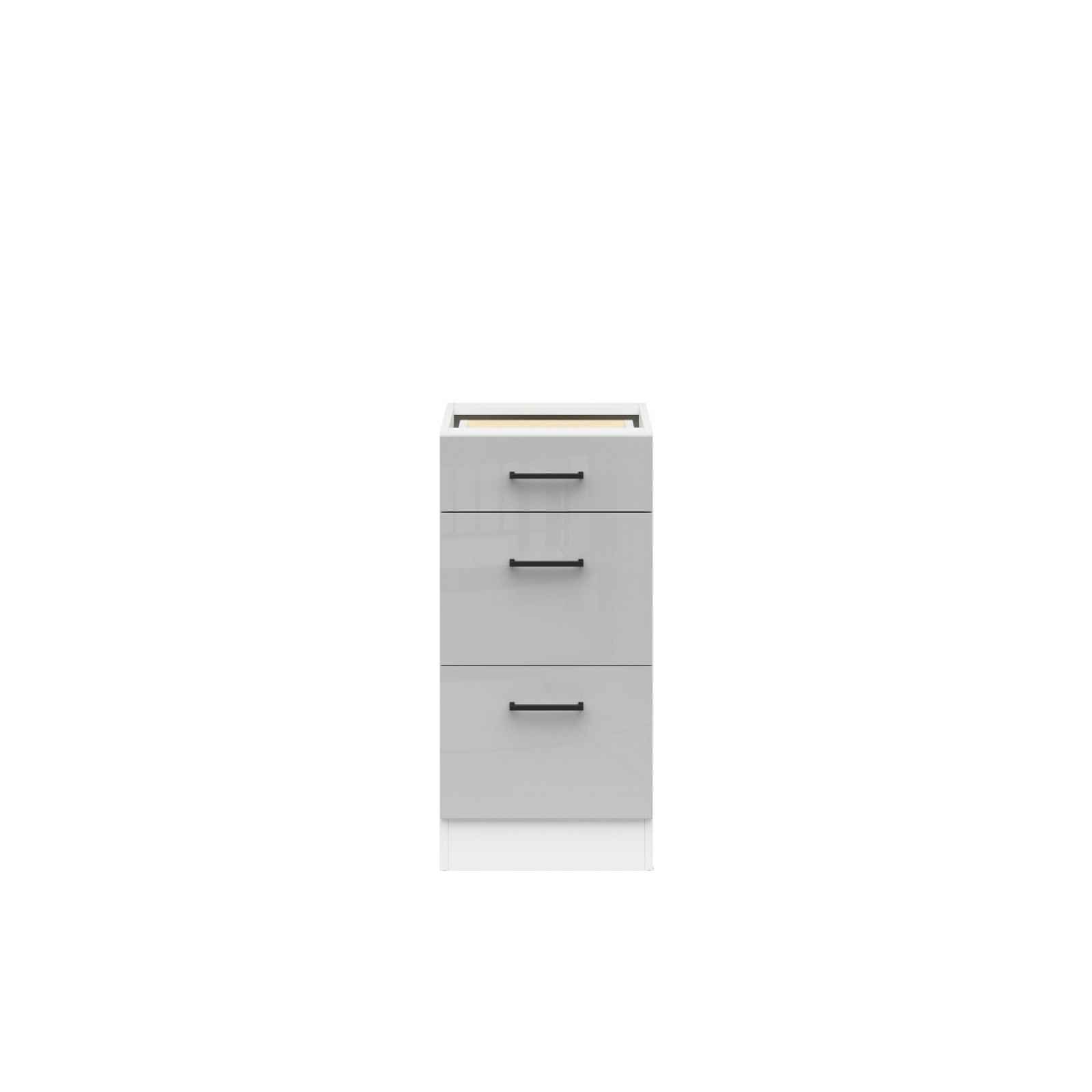 Kuchyňská skříňka dolní 40 cm se 3 šuplíky bez pracovní desky Materiál: kvalitní materiál LTD Rozměry (šxvxh): 40 x 82 x 47 cm Barva: - korpus: bílá - čela zásuvek: světle šedý lesk Dodaváno v demontu.