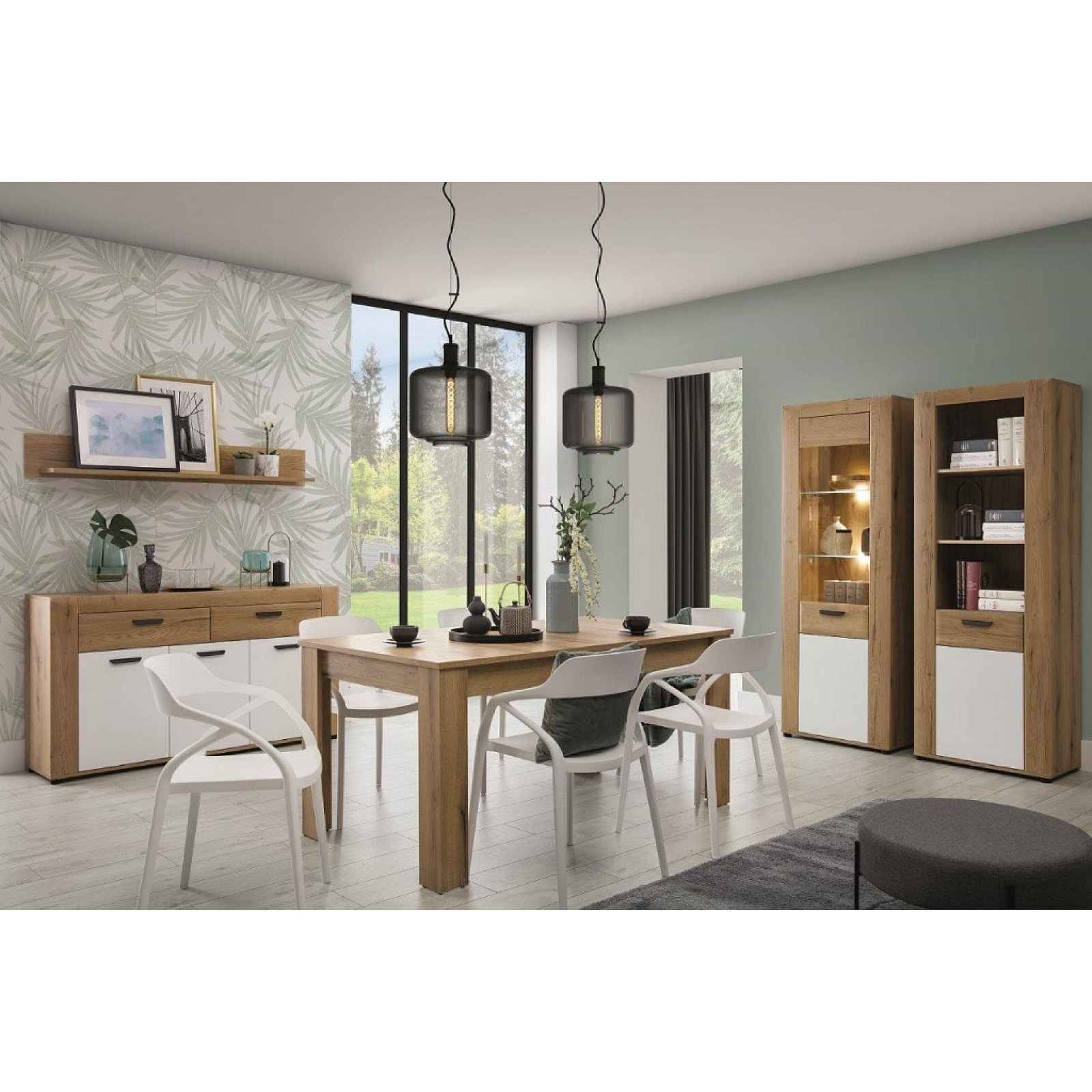 Vzorová sestava jídelny Uvádíme pouze jako ilustrativní příklad jedné z možných sestav, kterou lze poskládat z jednotlivých segmentů. Jednotlivé díly si je možno vybrat a koupit každý zvlášť. Příkladová sestava zahrnuje: - komoda 3D2S (šxvxh): 153 x 87,5 x 40 cm - závěsná police (šxvxh): 153 x 22 x 23,5 cm - rozkládací jídelní stůl (šxvxh): 160 - 200 x 76,5 x 90 cm - vitrína 1D (šxvxh): 66 x 192 x 40 cm- LED osvětlení, bílé teplé - regál 1D (šxvxh): 66 x 192 x 40 cm Barva: - korpus: dub evoke - dvířka: bílá alpský lesk Materiál: lamino/MDF - korpusy mají sílu 16 mm, vrchní desky 16 mm, ABS hrany 0,5 mm/1,5 mm - dvířka mají sílu lamina 16 mm/ MDF 18 mm, potaženy fólií PVC, tvrzené sklo (antison)- vnitřní poličky mají sílu 16 mm, ABS hrany 0,5 mm - nožky: plast bez možnosti regulace- úchyty: plast Zásuvky s plným výsuvem (pojezdy kuličkové GTV). Dodáváno v demontu.