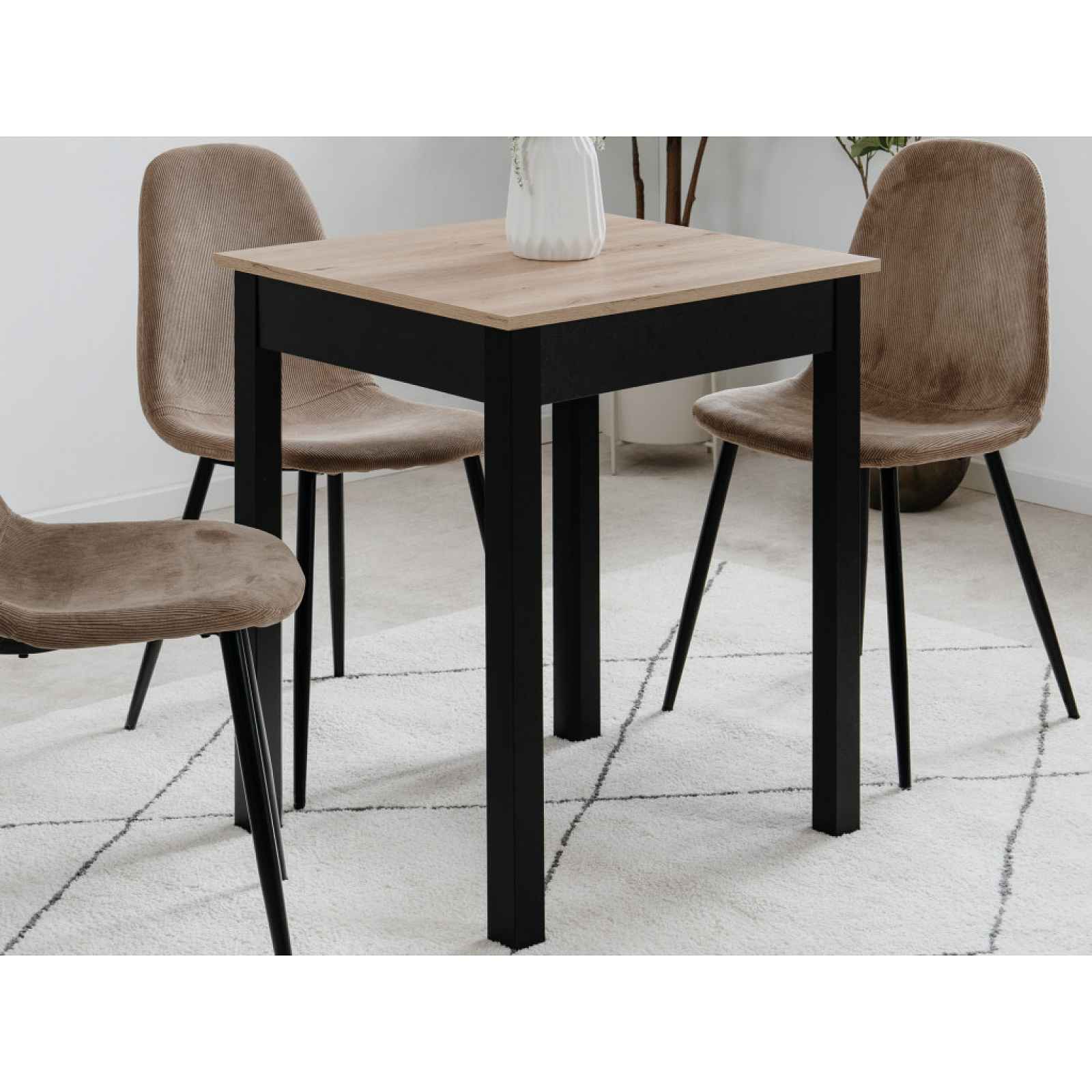 Jídelní stůl 60x67 cm je ideální do menší jídelny či kuchyňského koutu. Dekor dub artisan v kombinaci s černými nohami vytváří moderní kontrast a stylový vzhled. Jídelní stůl o velikosti 60x67 cm je ideální volbou do menší jídelny nebo kuchyňského koutu. Oceníte univerzální styl i pevnou a stabilní konstrukci. Útulný dřevěný dekor dub artisan je doplněn černými nohami, které vytvářejí atraktivní kontrast a dodávají stolu moderní a elegantní vzhled. - materiál: laminovaná dřevotříska 16 mm (ABS hrany), MDF, kov - dekor: dub artisan/černá mat - nohy: čtvercový profil (MDF 5x5 cm) - jídelní deska: plocha 60x67 cm - tloušťka jídelní desky: 16 mm (s ABS hranou) - tvar: obdélný - boční rámy pro vyšší stabilitu - vhodný i do malé jídelny/kuchyně - celková výška: 76 cm - volná výška pod rámem stolu: 64 cm - volná šířka mezi nohami stolu: 53 cm (čelní strana: 46 cm) - max. nosnost do 45 kg - stabilní konstrukce - univerzální styl - dodáváno v demontu
