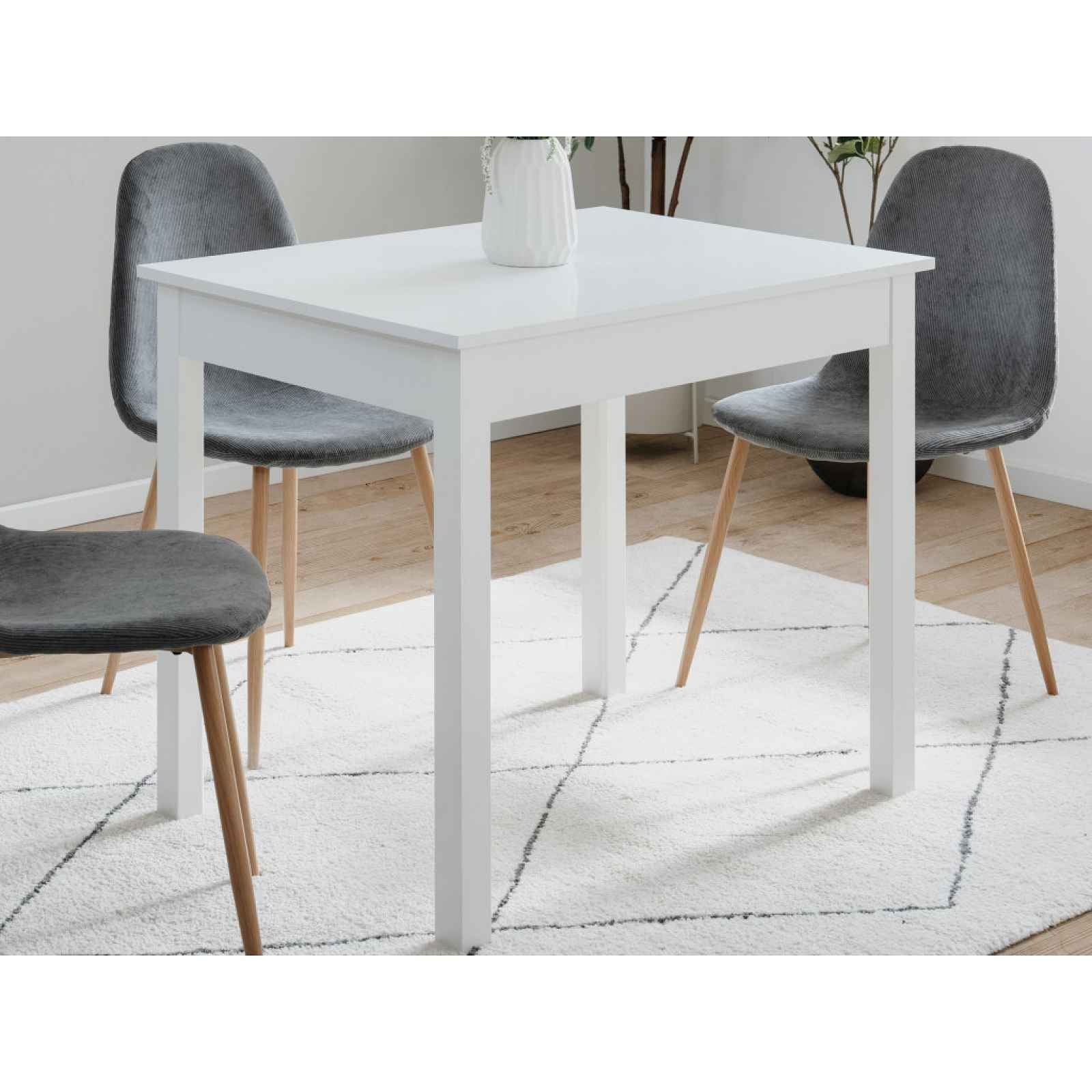 Jídelní stůl 90x67 cm je ideální do menší jídelny či kuchyňského koutu. Univerzální bílé matné provedení působí čistě a nadčasově. Jídelní stůl o velikosti 90x67 cm je ideální volbou do menší jídelny nebo kuchyňského koutu. Oceníte univerzální vzhled i pevnou a stabilní konstrukci se čtyřmi nohami. Provedení v bílé matné barvě působí čistě a nadčasově a snadno se kombinuje s různými styly interiéru. - materiál: laminovaná dřevotříska 16 mm (ABS hrany), MDF, kov - dekor: bílá mat - nohy: čtvercový profil (MDF 5×5 cm) - jídelní deska: plocha 90x67 cm - tloušťka jídelní desky: 16 mm (s ABS hranou) - tvar: obdélný - boční rámy pro vyšší stabilitu - vhodný i do malé jídelny/kuchyně - celková výška: 76 cm - volná výška pod rámem stolu cca: 64 cm - volná šířka mezi nohami stolu: 76 cm (čelní strana: 53 cm) - max. nosnost do 45 kg - stabilní konstrukce - univerzální styl - dodáváno v demontu