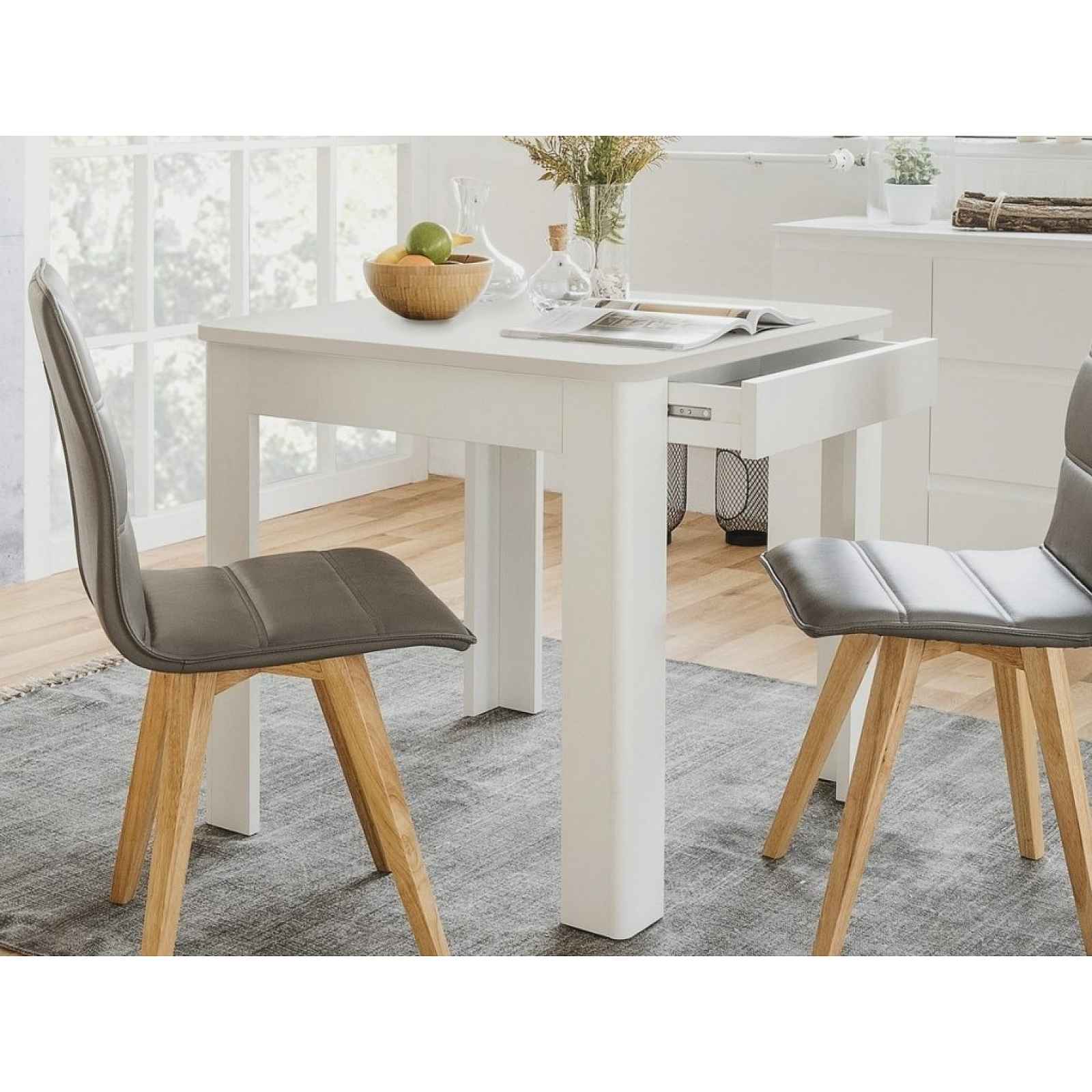 Čtvercový jídelní stůl o velikosti 80x80 cm má elegantně zaoblené hrany a v bočním rámu ukrývá praktický úložný šuplík. Vyroben v univerzální bílé barvě. Čtvercový jídelní stůl o velikosti 80x80 cm má elegantně zaoblené hrany a v bočním rámu ukrývá praktický úložný šuplík, kam můžete uschovat například prostírání, sešit se psacími potřebami nebo další věci, které chcete mít při ruce přímo u stolu. Čtvercový stůl má stabilní zesílenou konstrukci a je vyroben v univerzální bílé barvě. Rozměrově pasuje i do malého prostoru jídelny nebo kuchyně. - materiál: laminovaná dřevotříska 16 mm/22 mm (ABS hrany), MDF, kov - dekor: bílá mat - nohy: profil L, zaoblené vnější rohy - jídelní deska: síla 22 mm, ABS hrany - jídelní plocha: 80x80 cm - zaoblené rohy jídelní desky - zesílený boční rám - 1 x úložná zásuvka (ukryta v bočním rámu, kovové boční pojezdy, bezúchytové otevírání hranou, vnitřní rozměry cca 53x7x29 cm) - stabilní - volná šířka mezi nohami: 56 cm - volná výška pod bočním rámem: 61,5 cm - také do malého prostoru jídelny/kuchyně - do klasického i moderního interieru - dodáváno v demontu