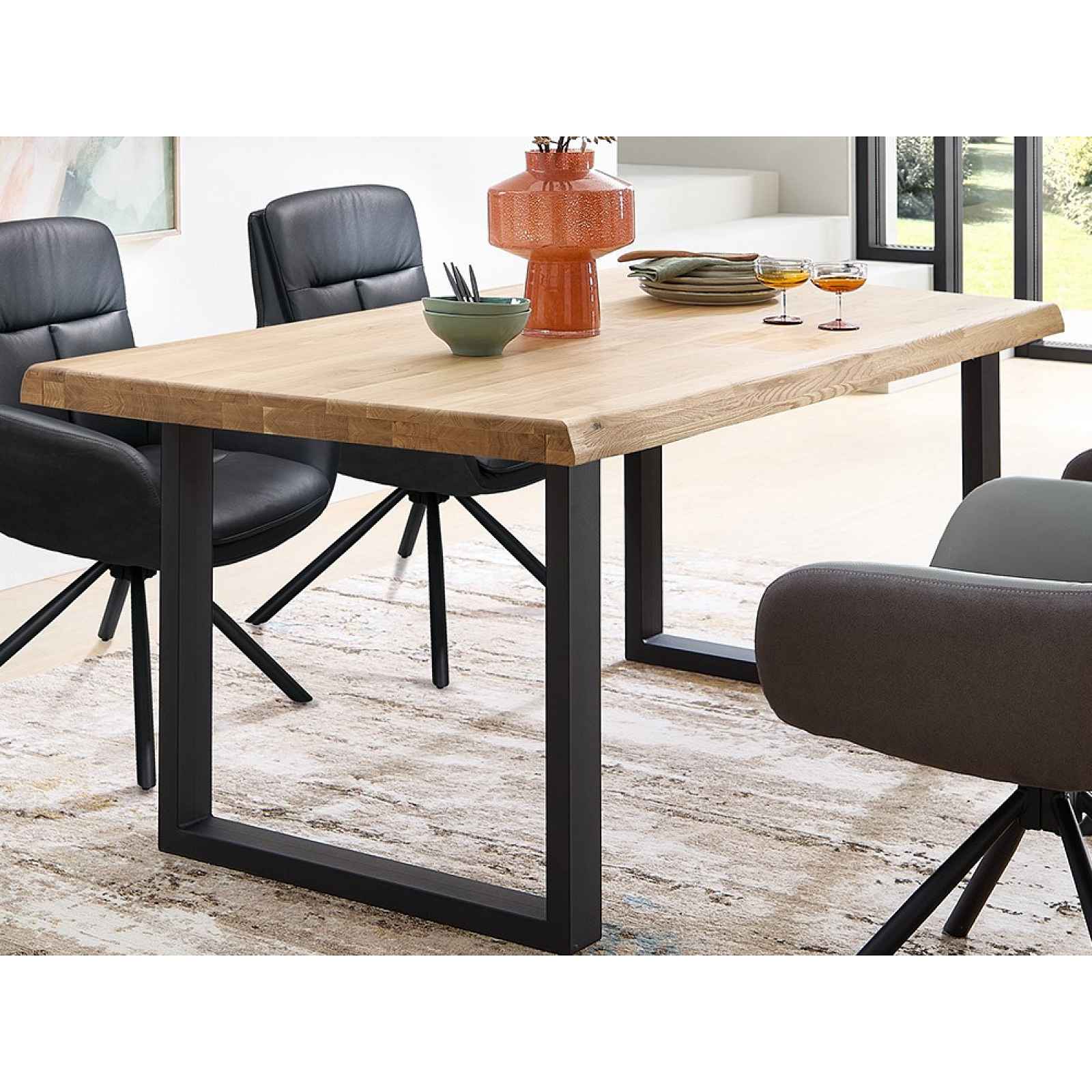 Jídelní stůl z masivního dubového dřeva o velikosti 160x90 cm je originálním spojením přírodní krásy a moderního designu.Navíc zaujme záměrně zvlněnými hranami. Jídelní stůl z masivního dubového dřeva o velikosti 160x90 cm je originálním spojením přírodní krásy a moderního designu. Dominantním prvkem jsou záměrně zvlněné hrany stolové desky, které podtrhují přirozenost dřeva a díky kterým vynikne efekt masivity. Jídelní stůl je usazen na robustní černé kovové podnoži ve tvaru písmene U, která stolu dodává moderní industriální nádech. Kovová konstrukce zajišťuje vysokou stabilitu a pevnost, takže stůl obstojí při každodenním používání i při větších rodinných setkáních. Spojení zvlněných přírodních hran, masivního dubu a pevné kovové podnože vytváří harmonický kontrast mezi surovostí přírody a čistotou moderního designu. Tento stůl se stane výrazným a nadčasovým centrem každé jídelny. - materiál: masivní dubové dřevo, kov - podnož: kov, černý matný lak, tvar U, hranatý profil 8x4 cm - dekor: přírodní dub, parketový motiv - olejová povrchová úprava (chrání povrch dřeva, dobře odolává vůči kapalinám a příjemná na omak) - plocha jídelní desky: 160×90 cm - síla jídelní desky: 40+20 mm - boční hrana: záměrně zvlněné hrany - stabilní konstrukce - moderní styl - dodáváno v demontu
