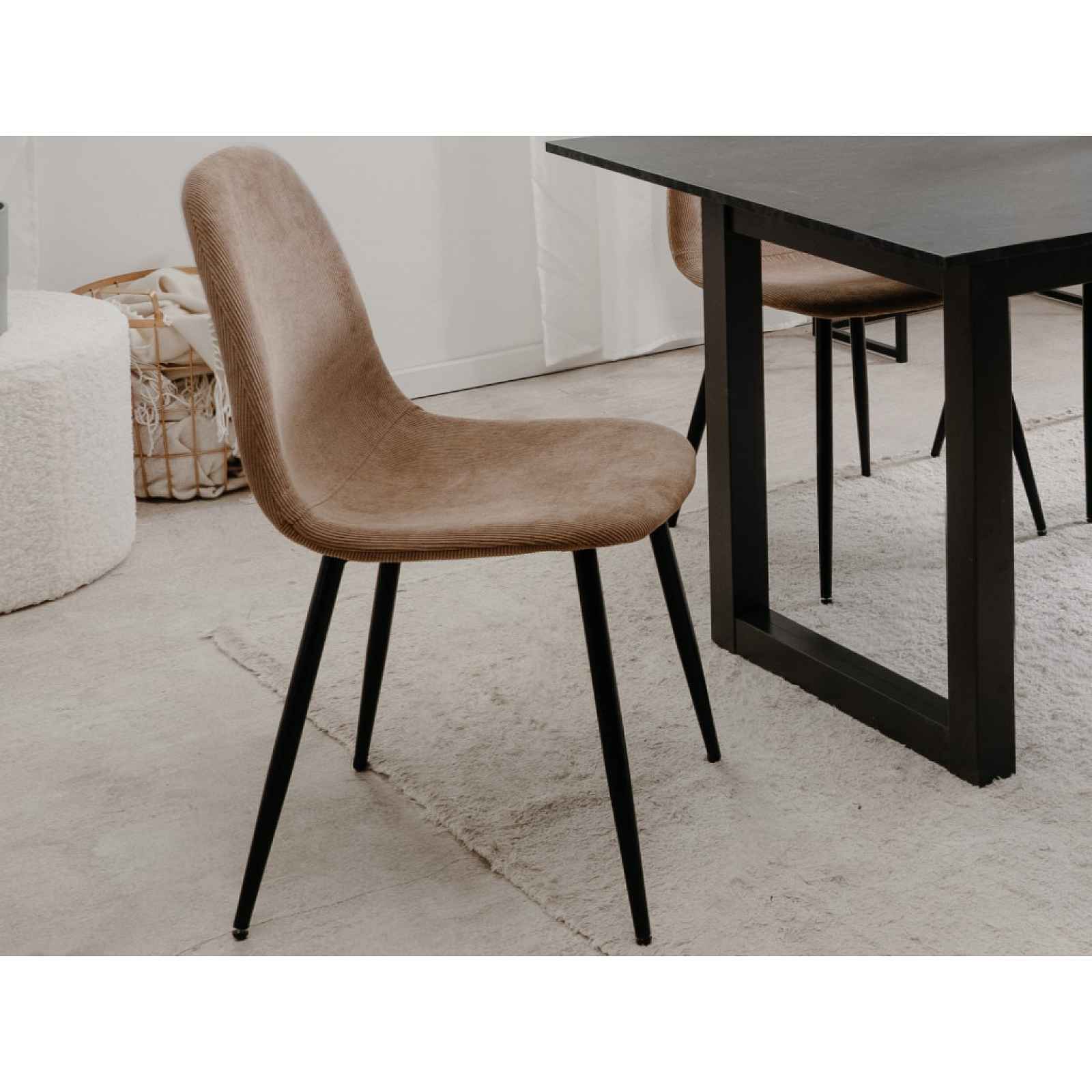 Pohodlně zaoblená židle na černých kovových nohách je stabilní a sedák má očalouněn měkkou strukturovanou látkou v barvě světle hnědá, která je velmi útulná. Tato židle se svým univerzálním stylem pasuje k téměř každému stolu a do každé jídelny. - konstrukce: kov, dřevovláknitá deska - podnož/nohy: kov, kruhový profil - povrchová úprava: černý matný lak - polstrovaný sedák/opěrák (polyuretanová výplň) - potah: látka Cord - měkká látka s proužkovanou strukturou, barva světle hnědá (složení: 100% polyester) - sedák: klasicky tuhý - opěrák: pohodlný zaoblený tvar, klasicky tuhý - výška sedu: 44 cm - hloubka sedu: 39 cm - šířka sedu: cca 43 cm - výška opěradla: cca 37 cm - univerzální styl do každé jídelny - stabilní - doporučená nosnost do 130 kg - dodáváno v demontu