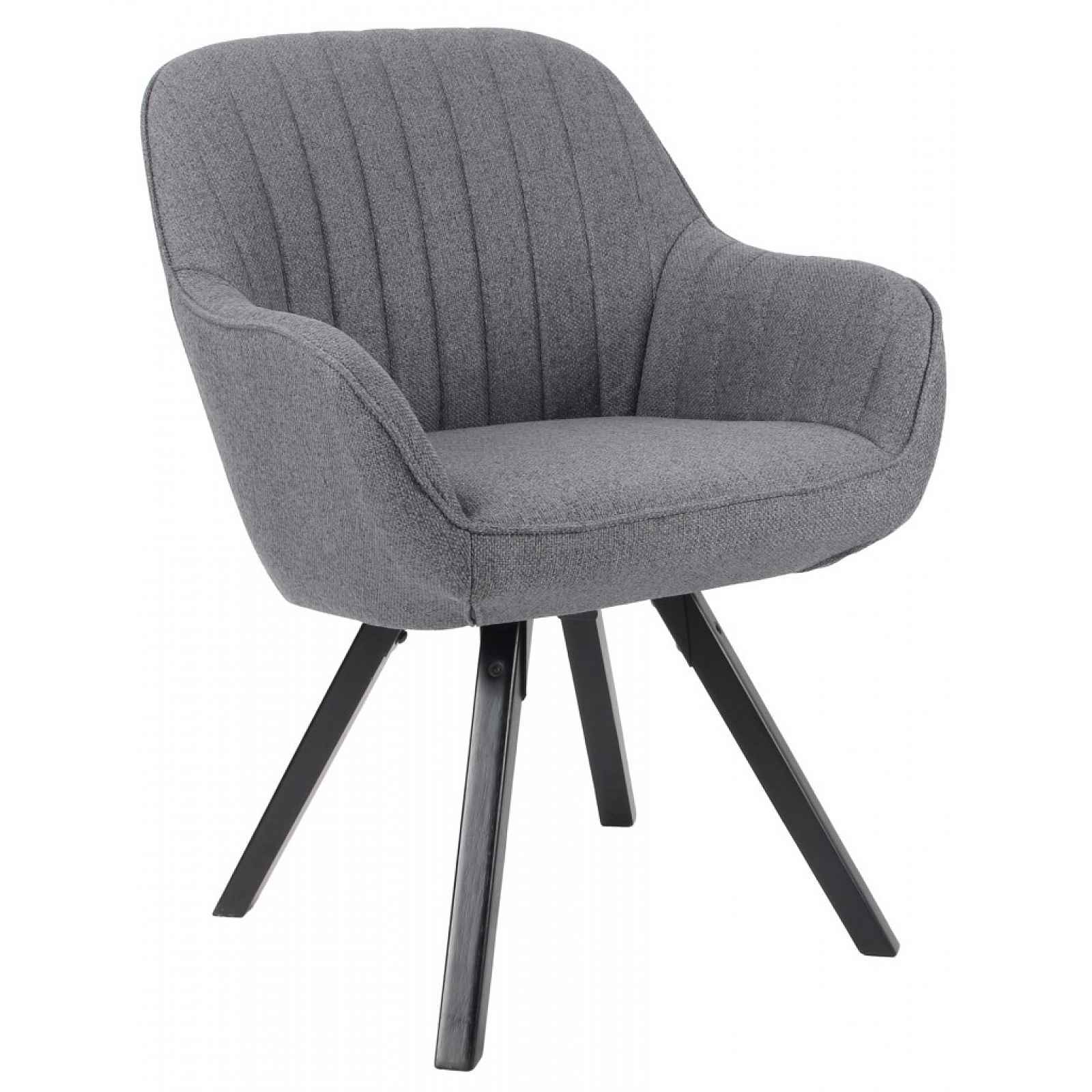 Pohodlná jídelní židle ve tvaru zaobleného křesílka je očalouněna tkaninou v barvě středně šedá. Podnož z černě lakovaného masivního dřeva zajišťuje stabilitu. - konstrukce: masivní kaučukové dřevo, kov, dřevovláknitá deska - podnož/nohy: hranatý profil, masivní kaučukové dřevo - povrchová úprava: černý lak - tvar křesílka - polstrovaný sedák/opěrák (polyuretanová výplň) - potah: látka Lumos 16 – jemně strukturovaná polyesterová tkanina, barva středně šedá (složení: 100% polyester, otěruvzdornost: 40.000 cyklů) - svislý prošev potahu, zádový zip - sedák: klasicky tuhý - opěrák: komfortní sklon - sedák otočný o 360° - výška sedu: 48 cm - hloubka sedu: 46 cm - šířka sedu: 40 cm - výška opěradla: 38 cm - trendový styl - stabilní - doporučená nosnost do 110 kg - dodáváno v demontu