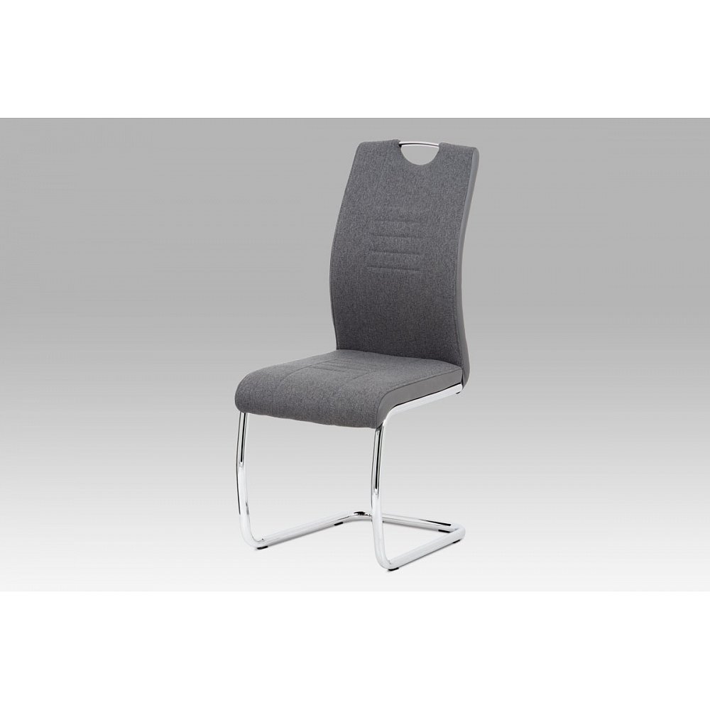 Jídelní židle Elegantní jídelní židle na kovové pohupové podnoži s chromovou úpravou. Díky lehkému prohnutí podnože dochází k posunutí těžiště židle více dozadu, čímž je židle méně náchylná k překlopení dopředu. Lehké prohnutí též plní funkci estetickou, jelikož se jedná o design vskutku méně tradiční. Sedák a opěrák potaženy látkou šedé barvy a boky očalouněné stejnobarevnou ekokůží. Díky kovovém madlu s chromovou úpravou bude manipulace s židlí naprostá hračka. Sedák s opěrákem mají navíc elegantní prošití, díky kterému se židle stane ozdobou Vaší kuchyně, či jídelny. Nosnost židle je až 110 kg. Rozměr (šířka x hloubka x výška): 43 x 44 x 101 cm, výška sedu 45 cmDodáváno v demontu, záruka 24 měsíců.