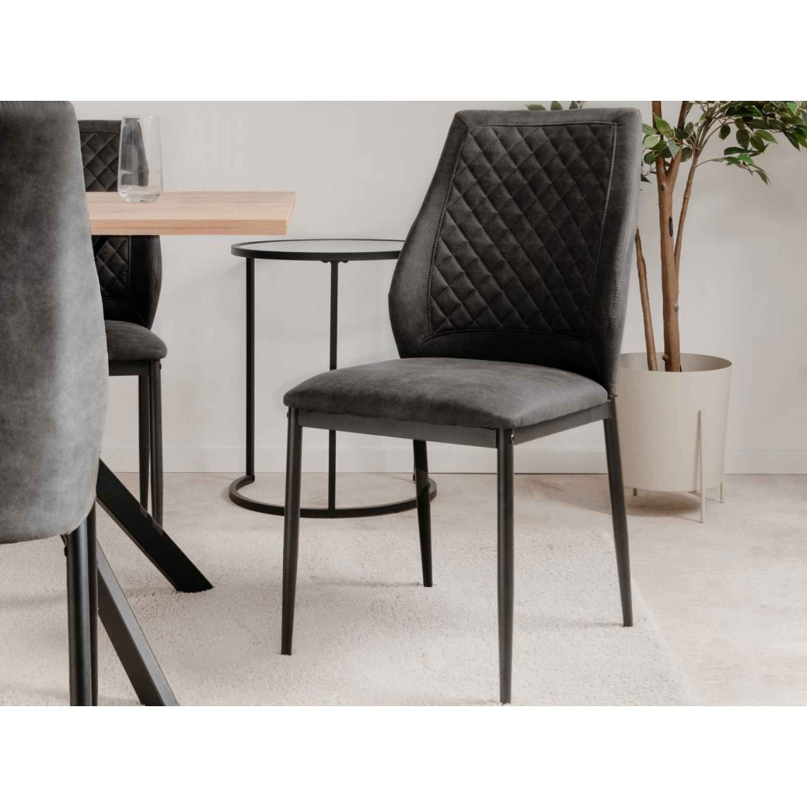 Moderní jídelní židle na černé kovové podnoži má pohodlné opěradlo s elegantním okrasným proševem. Očalouněna antracitovou látkou ve vintage optice kůže. Moderní jídelní židle na černé kovové podnoži má pohodlně tvarované opěradlo s elegantním okrasným proševem. Židle je očalouněna antracitovou látkou ve vintage optice broušené kůže, která spolu s prošíváním zaujme na pohled. Tato pohodlná židle dobře pasuje k jakémukoliv typu stolu. - konstrukce: kov, dřevovláknitá deska - podnož/nohy: kruhový profil - povrchová úprava: černý matný lak - polstrovaný sedák/opěrák (polyuretanová výplň) - potah: látka ve vintage optice broušené kůže, barva antracitová temně šedá (složení: 100% polyester) - okrasné prošívání - okrasný zádový zip - sedák: středně tuhý - opěrák: pohodlný tvar a boční vedení, středně tuhý - výška sedu: 49 cm - hloubka sedu: 45 cm - šířka sedu: 45 cm - výška opěradla: cca 47 cm - moderní elgantní styl - stabilní - doporučená nosnost do 130 kg - dodáváno v demontu