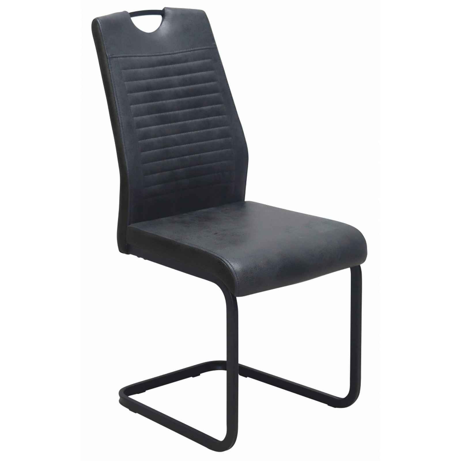 Jídelní židle na kovové podnoži má horizontálně prošitý opěrák a zajímavě řešený potah v kombinaci černé ekokůže a antracitové látky v optice lesklé kůže. Jídelní židle na kovové podnoži má horizontálně prošitý opěrák a zajímavě řešený potah v kombinaci černé ekokůže a látky v optice lesklé kůže v barvě antracitová. Ideálně se hodí do moderní kuchyně a jídelny. - konstrukce: kov - podnož/nohy: hranatý profil - povrchová úprava: černý lak - polstrovaný sedák/opěrák (polyuretanová výplň) - potah sedák/opěrák: látka v optice lesklé kůže, barva antracitová tmavě šedá - potah boční lem: ekokůže, barva černá - okrasný horizontální prošev opěradla - sedák: středně tuhý, prostorný - opěrák: vyšší, příjemný sklon - kovové madlo v horní části opěradla (černý lak) – pro snadné odsouvání židle od stolu - moderní styl - výška sedu: 48 cm - hloubka sedu: 43 cm - výška opěradla: 53 cm - doporučená nosnost do 100 kg - dodáváno v demontu