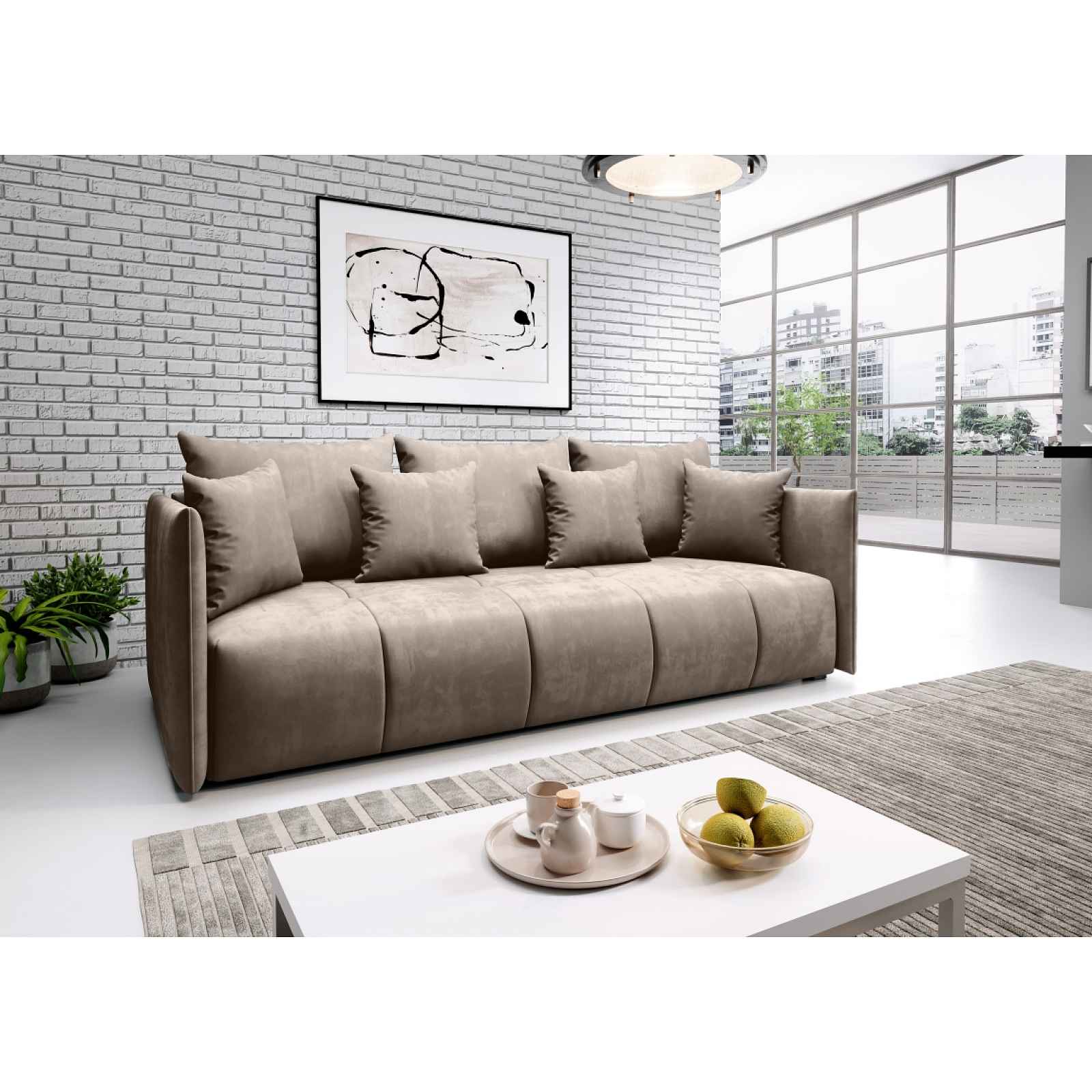Rozkládací pohovka - trojsedák Potahová látka: monolith 09 = světle hnědá látka Součástí jsou polštáře se zapínáním na zip a úložný prostor.Celočalouněná, vhodná do prostoru. Obrázek rozložené pohovky je ilustrativní (jiná barva)! Rozměr (šxvxh): 210 x 98 (74 cm bez polštářů) x 105 cm Ložná plocha (šxh): 196 x 148 cmVýška sedu: 40 cmHloubka sedu: s polštáři 58 cm, bez polštářů 90 cmRozměry úložného prostoru (šxh): 191 x 70 cm Materiál: pružina vlnitá, owata, polyuretanová pěna T30 Nohy plastové. Dodáváno v demontu. Záruka 24 měsíců.