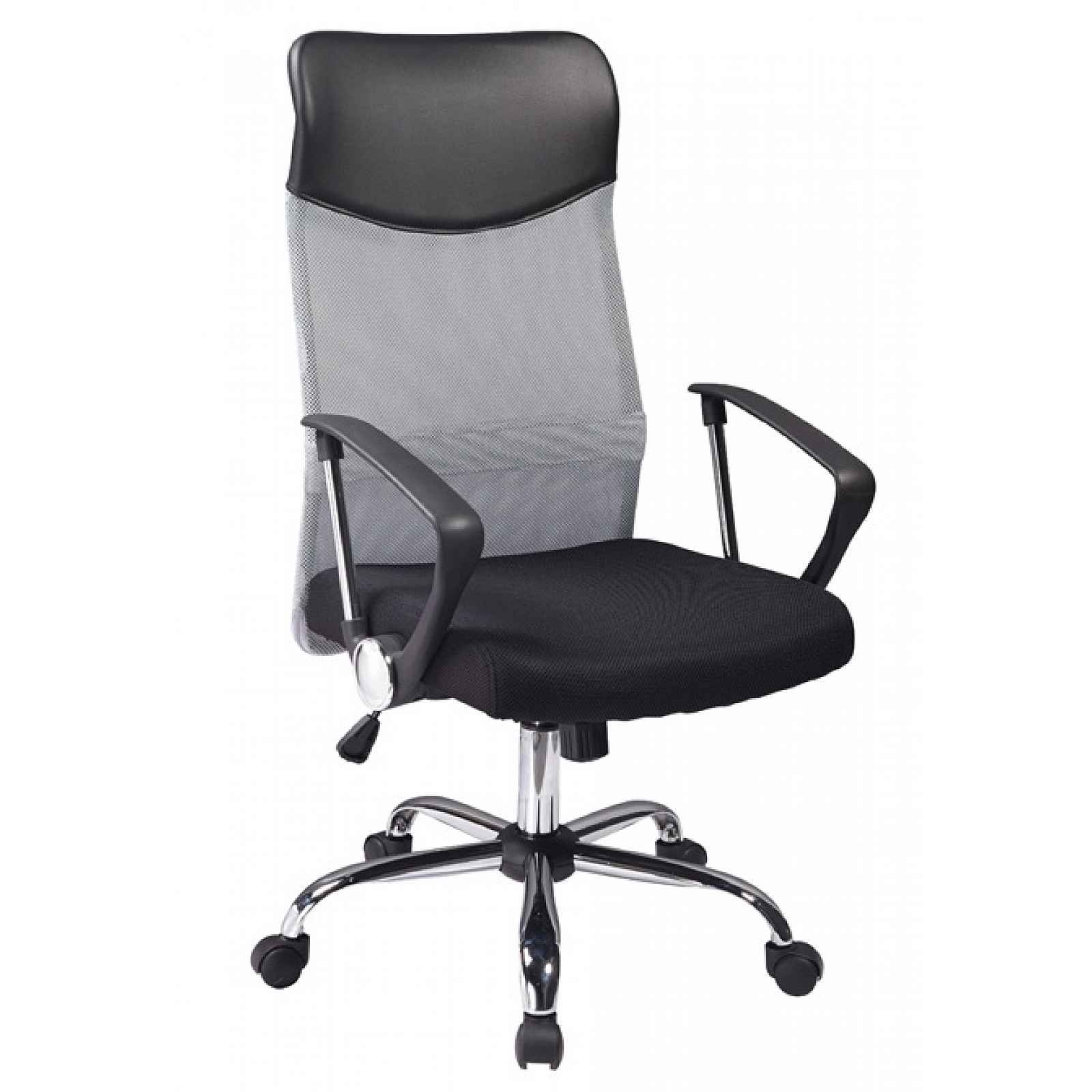 Kancelářská židle Otáčecí kancelářská židle, kovový podstavec je pochromovaný. Sedák a část opěradla je z membránové tkaniny černé barvy, další část opěradla je ze síťky. Nastavitelná výška sedadla je v rozmezí 45 - 53 cm. Výška: 111-120 cmŠířka: 62 cmHloubka: 50 cmBarva: šedá/černá Materiál: chrom, látka, plastDodáváno v demontu, záruka 24 měsíců.