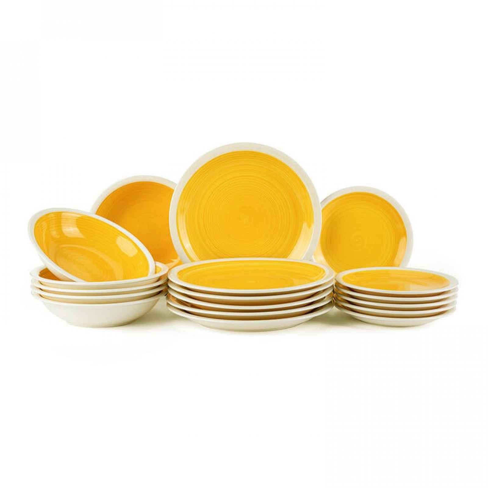 Decentní keramická jídelní souprava v krásné hořčicově žluté barvě s bílým okrajem bude příjemným osvěžením pro váš jídelní stůl. Skvěle se hodí pro každodenní stolování, ale i slavnostní příležitosti. Talíře jsou vhodné do myčky nádobí i do mikrovlnné trouby. Navrženo v Itálii. Vhodné i jako dárek. V naší nabídce naleznete i další barevné varianty souprav Jaipur. Sada obsahuje: 6x hluboký talíř, průměr 20 cm 6x mělký talíř, průměr 26 cm 6x dezertní talíř, průměr 19 cm Materiál: keramika Vhodné do myčky nádobí: ano Vhodné do mikrovlnné trouby: ano