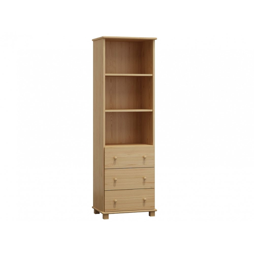 Policová knihovna se třemi šuplíky Materiál: masiv borovice (tloušťka desky 2 cm) Rozměry (šxvxh): 60 x 190 x 42 cm Čtvercové nohy: 5 x 5 cm Dodáváno v demontu. Záruka 24 měsíců.