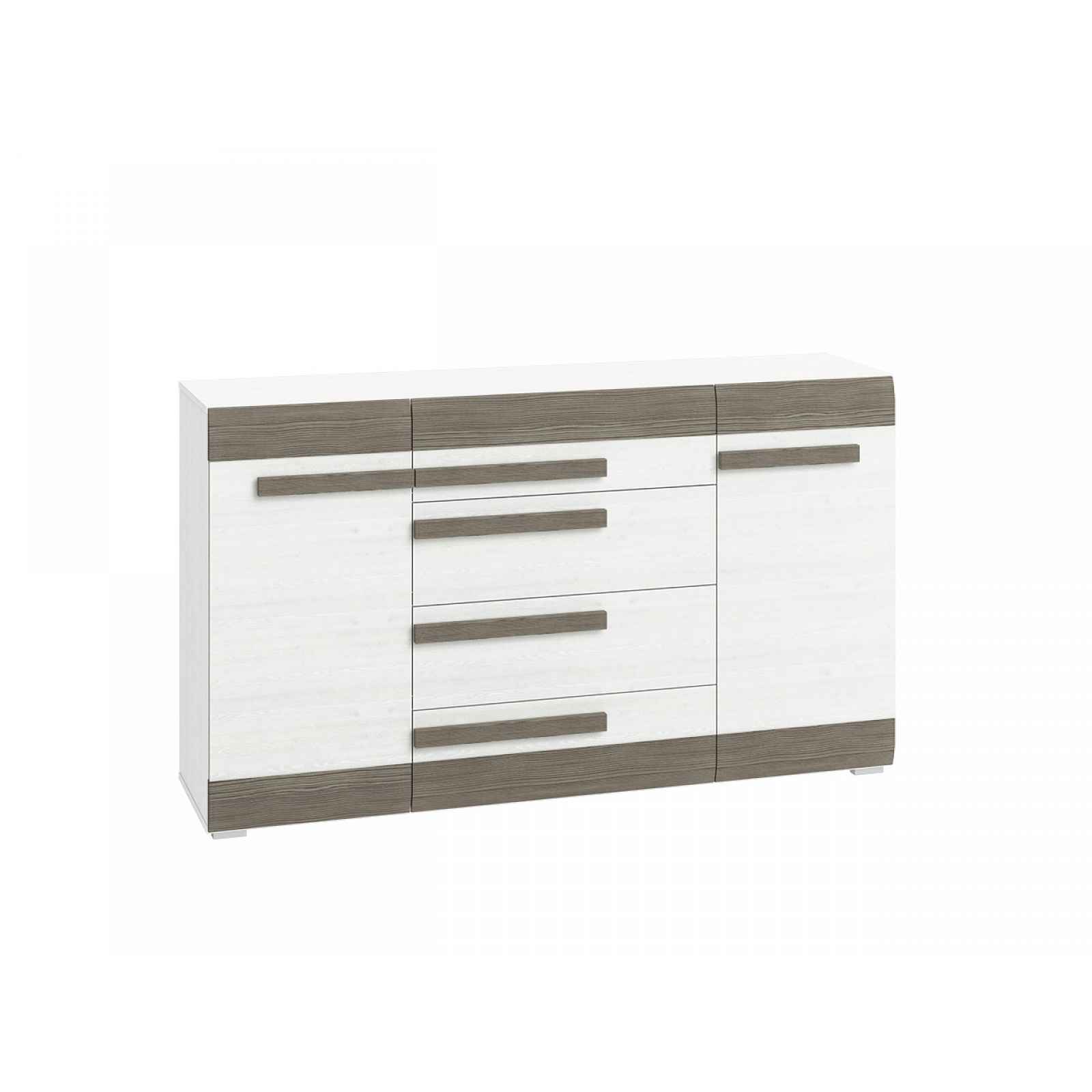 Komoda Bibiana Dodáváno v dekoru borovice sněžná/šedá Nosnost zásuvek 5 kg Nosnost dřevěných polic 10 kg ABS hrany Vyrobeno z laminovaných desek Nábytek dodáván v demontu Rozměry: (šířka x výška x hloubka) 165x96x42 cm