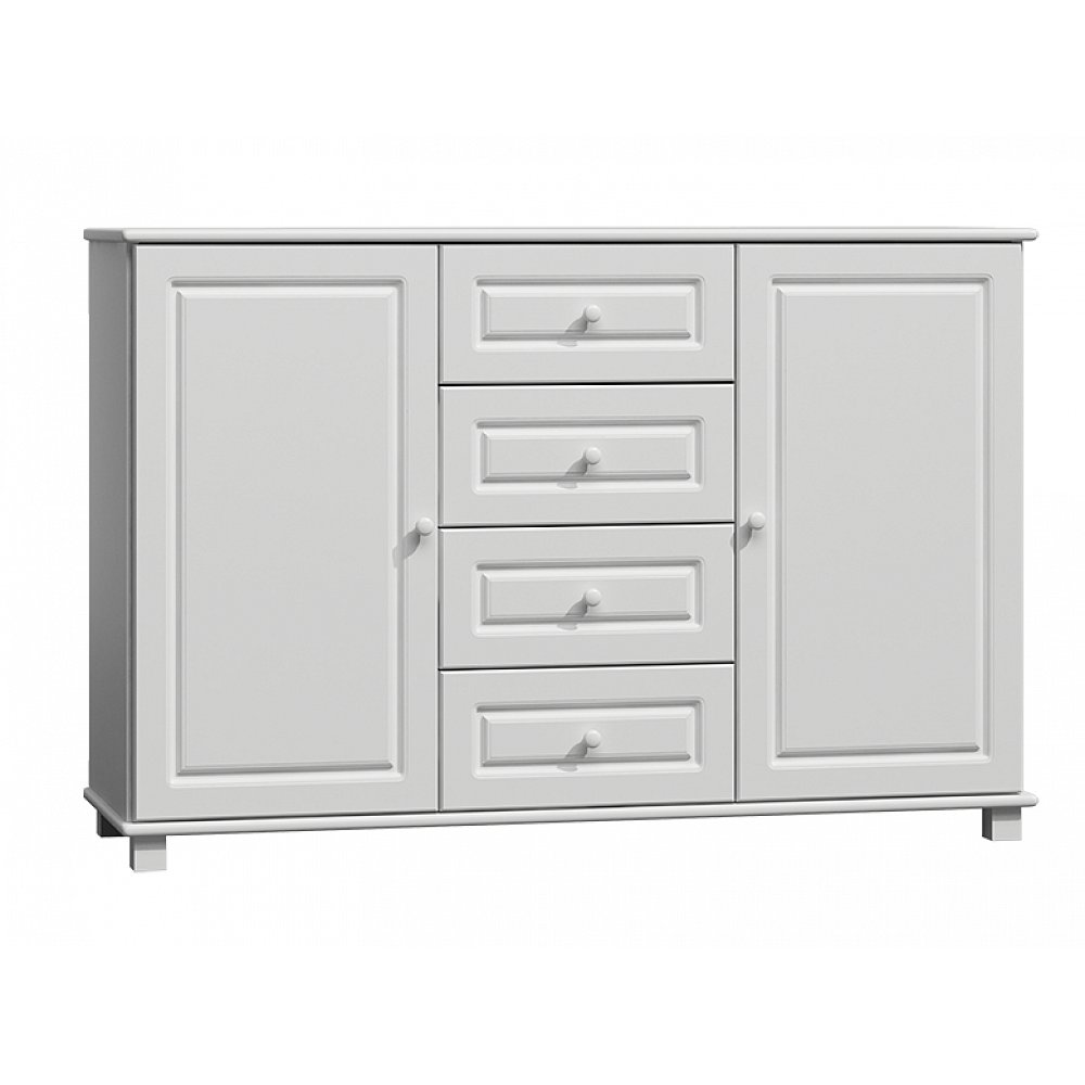 Kombinovaná komoda se čtyřmi zásuvkami Materiál: masiv borovice Barva moření: bílá Rozměry (v x š x hl): 100 x 150 x 45 cm Vnitřní členění: za dvířky 1 police Dodáváno v demontu. Záruka 24 měsíců.